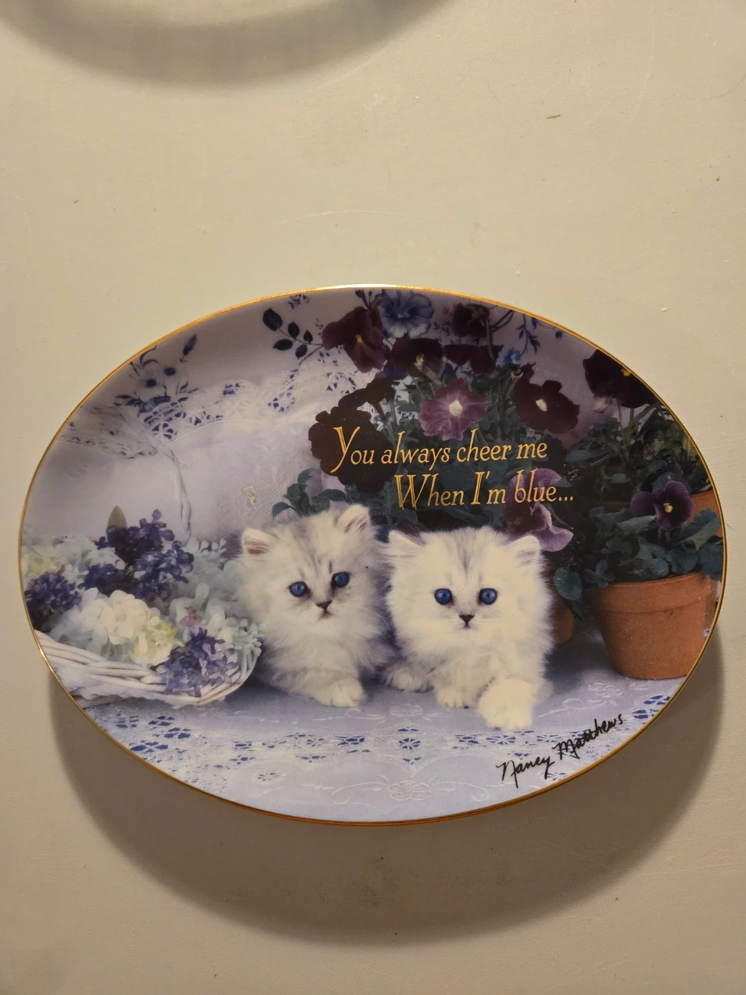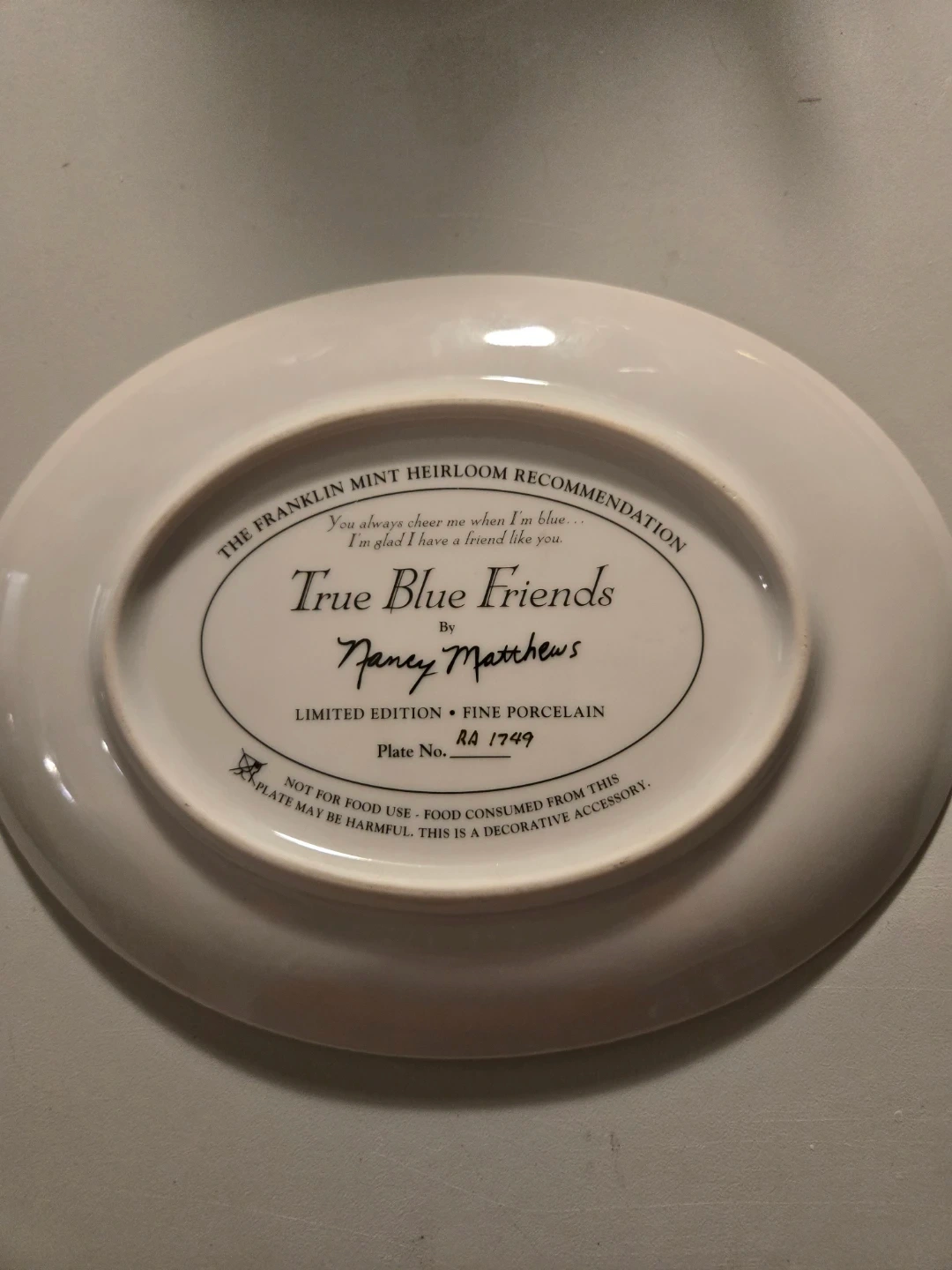 Selling a Franklin Mint collector's plate titled 'True Blue Friends' by Nancy Matthews. It's a limited edition fine porcelain plate, marked as plate number RA 1749. Please note it is a decorative accessory and not for food use