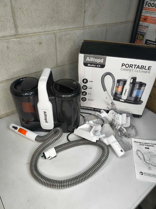 68Ailltopd C5 Portable Carpet & Upholstery Spot Cleaner – Powerful 500W Suction, Compact Design. New (Open Box). Box opened but item unused — tested! 【 Space-Saving & Easy Storage 】 Compact and lightweight design allows for easy storage under sinks or in closets. Wires, hoses, and brushes can be neatly stored on the machine’s dedicated hooks and brackets, keeping your home organized. 【 Powerful Suction for Deep Cleaning 】 Equipped with a 500W motor delivering 15Kpa suction, this portable spot cleaner quickly removes stubborn stains from carpets, rugs, upholstery, and indoor decorations. Handles dirt, wine, pet accidents, and more with ease. 【 Efficient Cleaning & Quick Drying 】 Spray, brush, and suction in one seamless process to clean surfaces thoroughly. Carpets and upholstery dry quickly, allowing your home to return to normal in no time, while maintaining a healthier and safer environment. For Sale By: Owner
