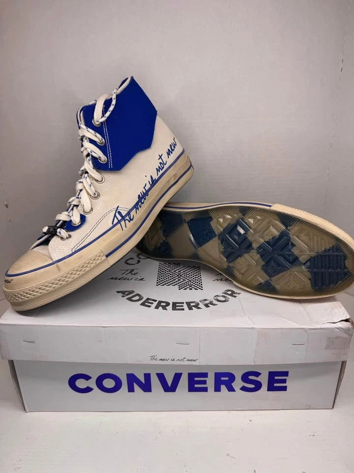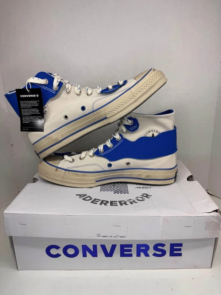 109Converse joined forces with South Korean label Ader Error for this reimagined iteration of the iconic Chuck 70 high-tops. Founded in 2014, Ader Error describes its own philosophy using the tagline, ‘But near missed things’, implying its focus on highlighting everyday objects through re-editing and adapting. That approach is on full display with these sneakers as the pair flaunts a deconstructed, patchwork aesthetic and faded logo print on the tongue. The collaboration is inspired by the slogan, 'Create Next: The new is not new' which can be seen partially printed and embroidered to the side. Made in Italy