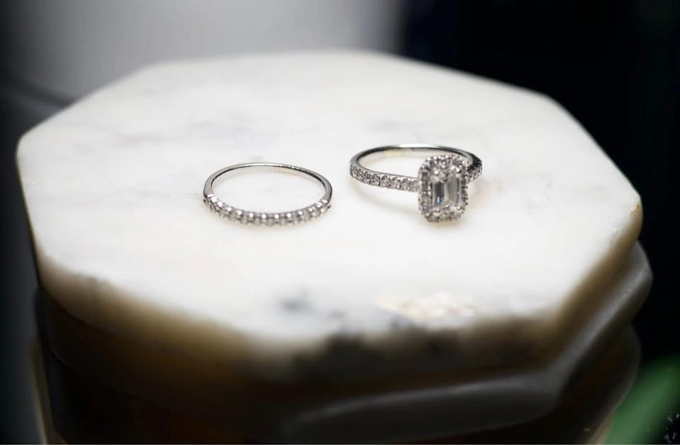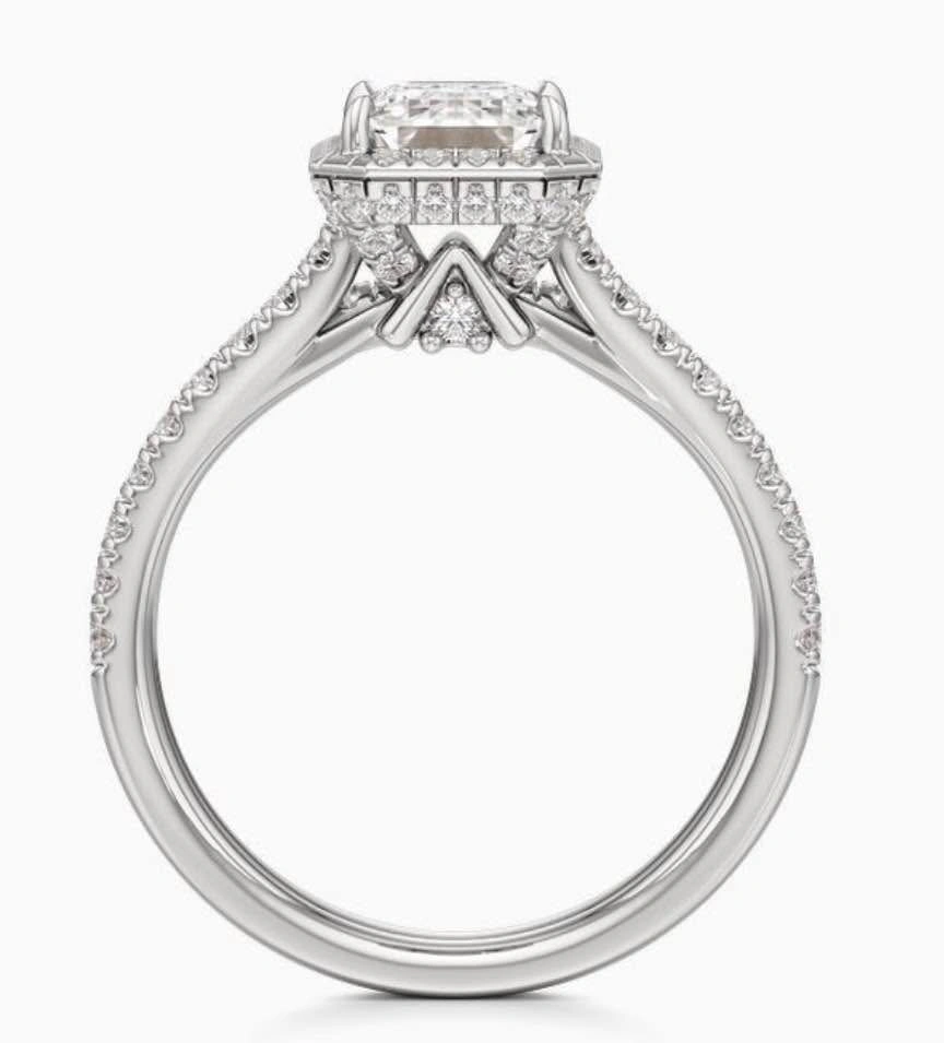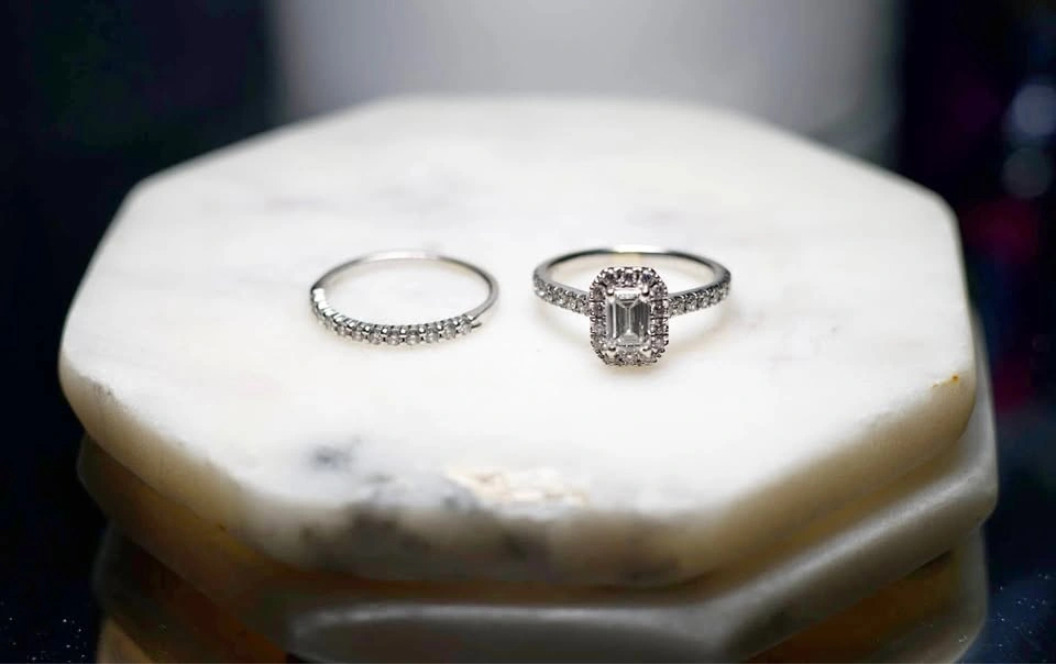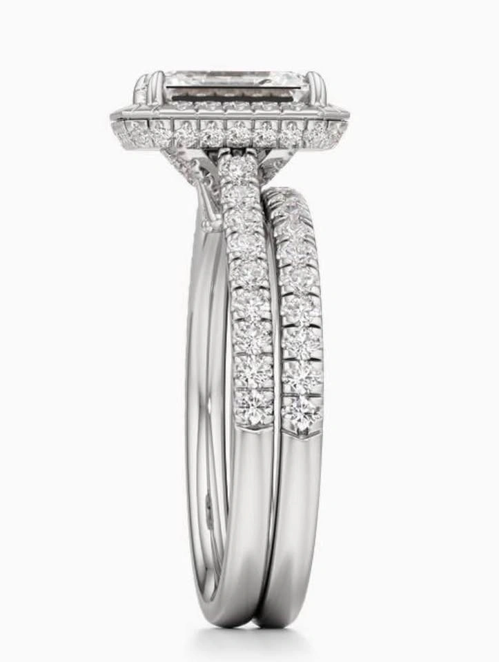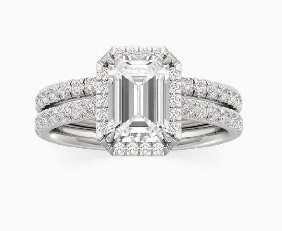 New wedding ring set, size 6.5. Crafted in timeless 14K white gold, this ring boasts emerald-cut center diamond complemented by 46 round brilliant cut lab grown diamonds. Ring specifications: Metal: 14K White Gold Item Width: 10.00mm Style: Halo Gems Stone: Diamond Stone Shape: Emerald Stone Cut: Emerald Cut Diamond Center Stone Carat Weight: 1 1/4 ct. Diamond Carat Weight: 1 3/4 ctw Diamond Type: Lab Grown Diamond Minimum Color: HI Diamond Minimum Clarity: VS2 Center Diamond Certification: GCAL Let me know if you're interested!