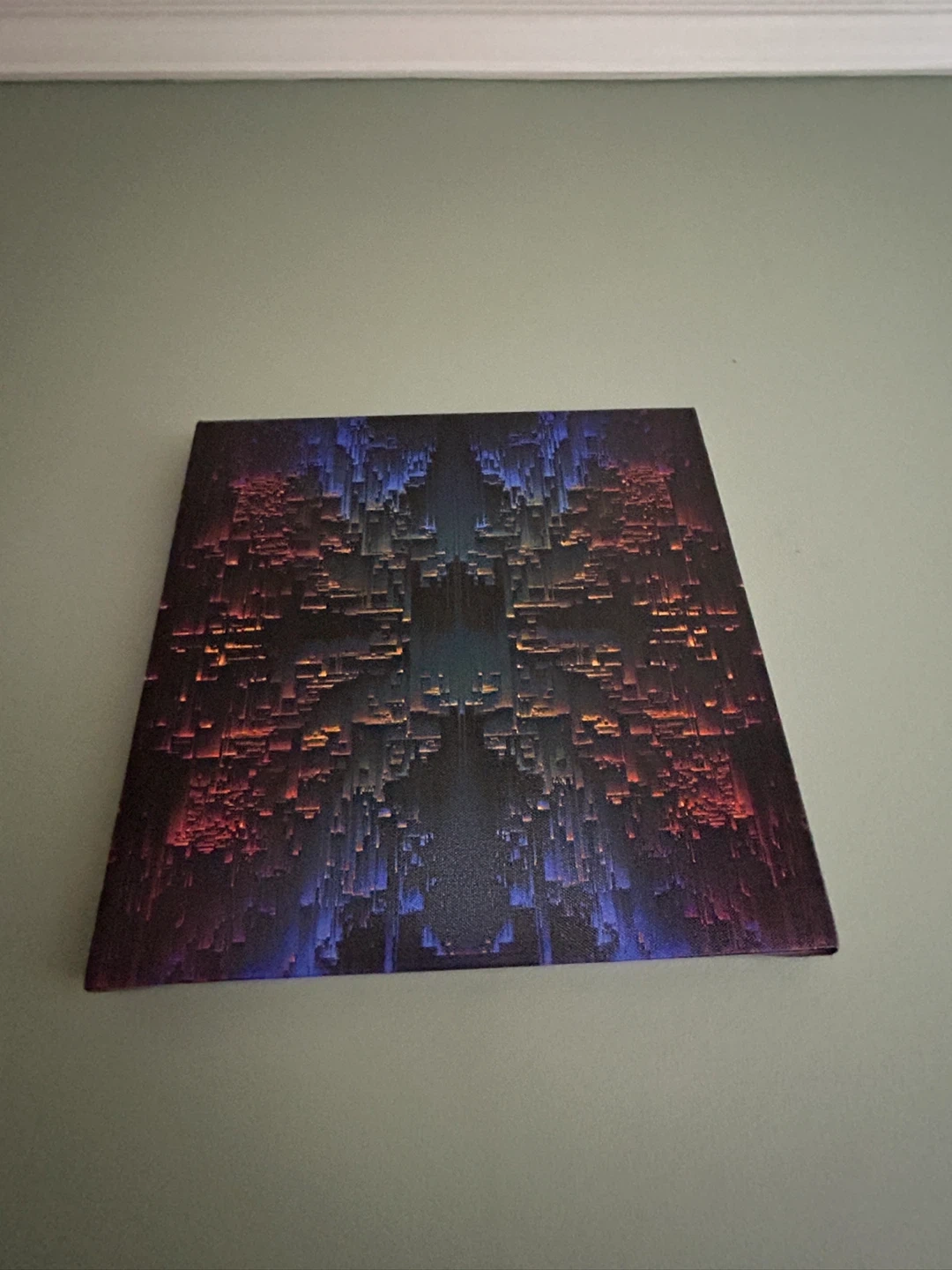 Selling a unique piece of abstract pixel art on canvas! It measures 12x12 and features a cool design with blue, red, and black colours. It's in great condition and would look great in any room! Sold by artist