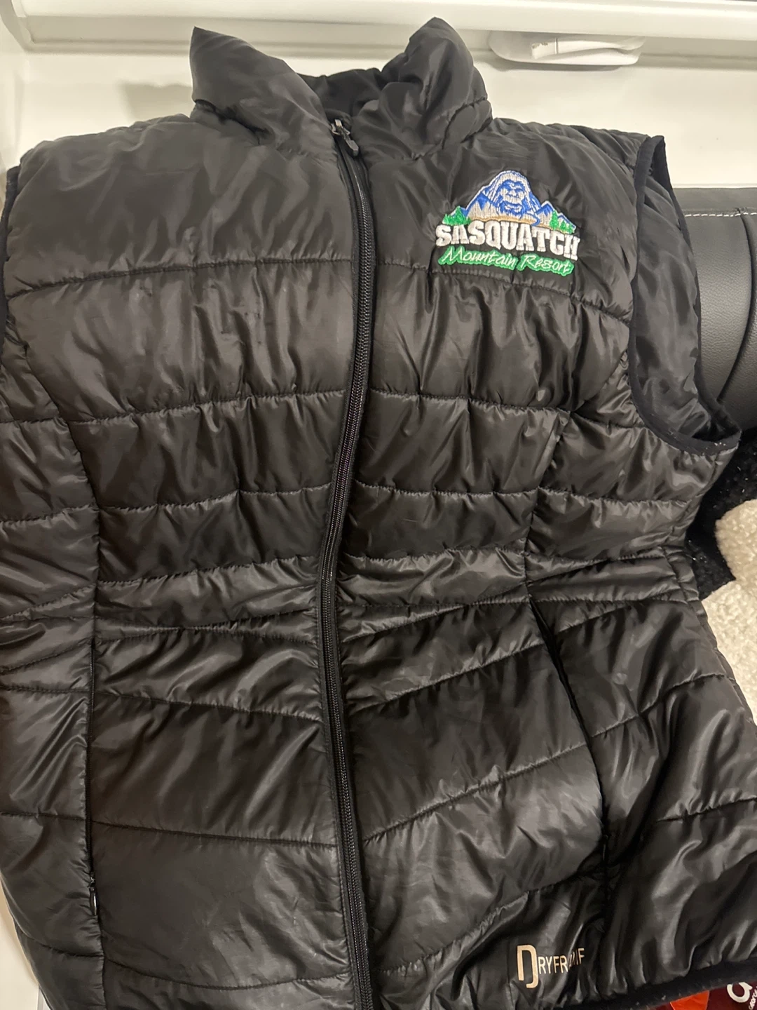 97Here's a black puffer vest from Sasquatch Mountain Resort! It's in great shape and ready to keep you warm.
