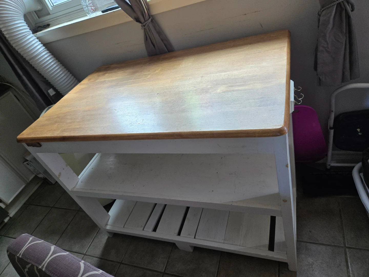 Selling a kitchen island cart with a wooden top and white painted base. It features open shelving for storage and a butcher block style top. Great for extra counter space or as a movable kitchen workstation! It is in good condition but does have some wear and tear.