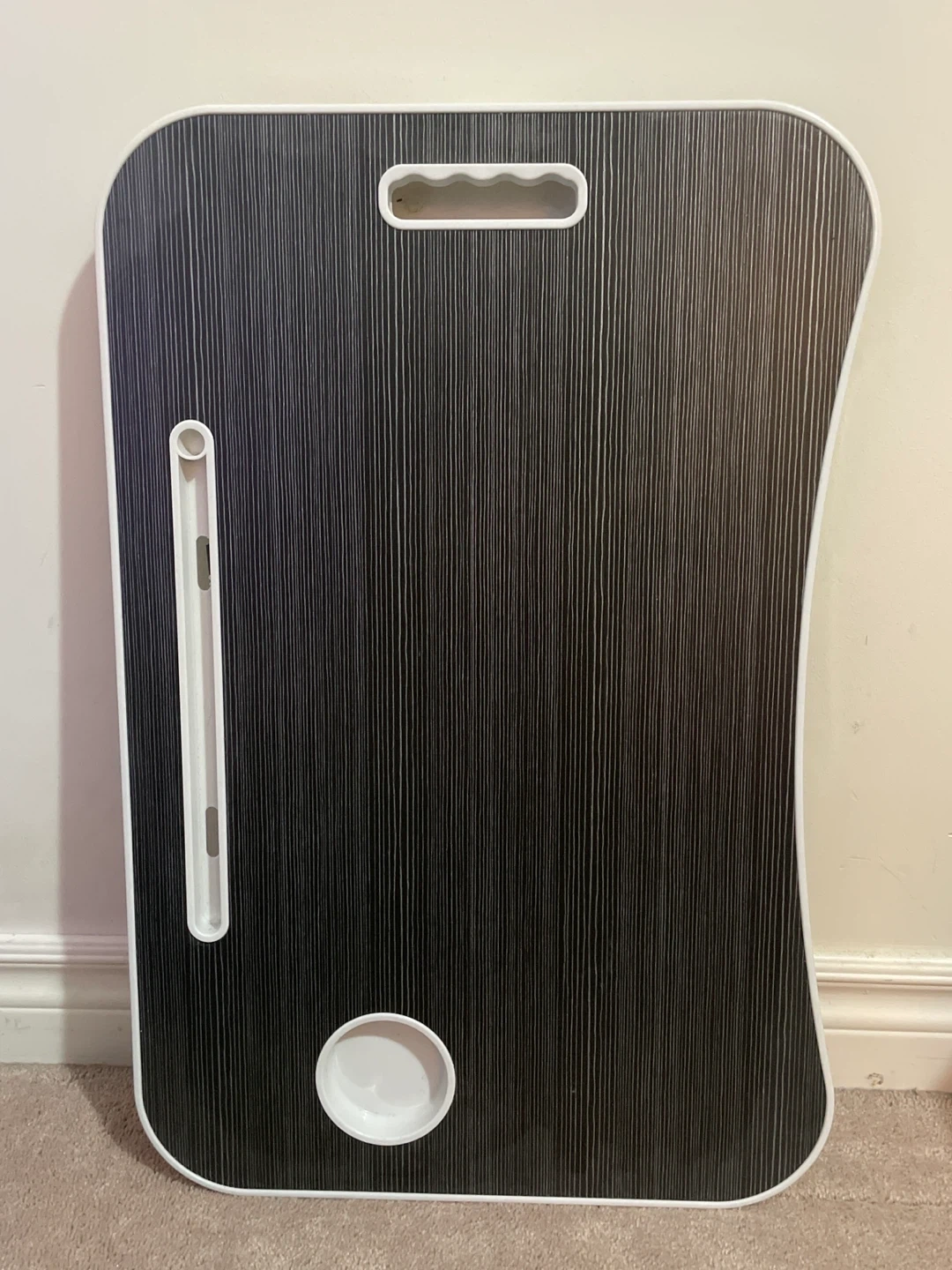 Here's a handy lap desk perfect for working or relaxing! It features a cup holder and a tablet slot, making it easy to keep everything organized while you're on the couch or in bed. It's in great condition and ready for a new home
