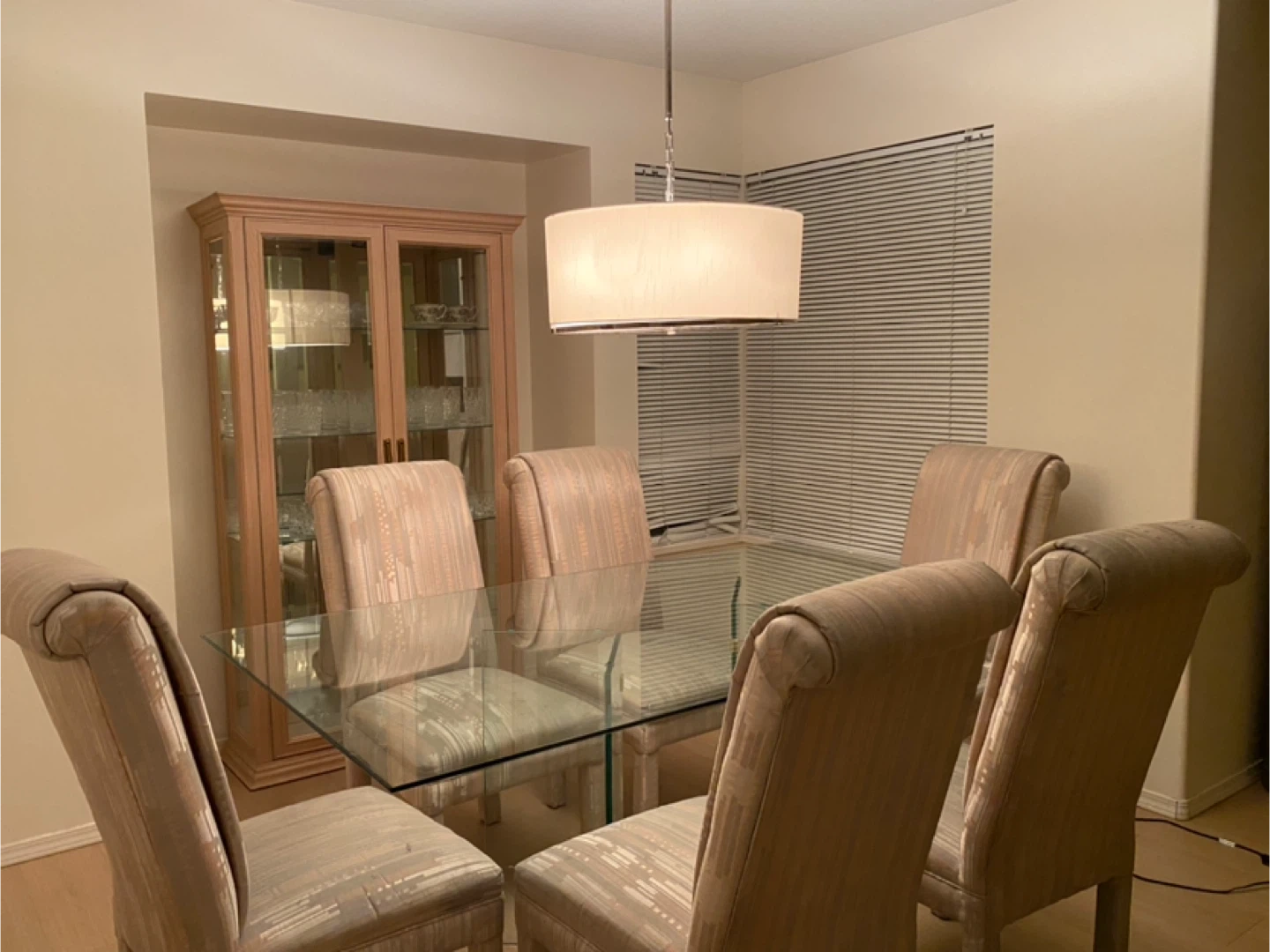 6 person dining table for sale with matching display cabinet, it’s all glass, no scratches, chairs are in really good condition