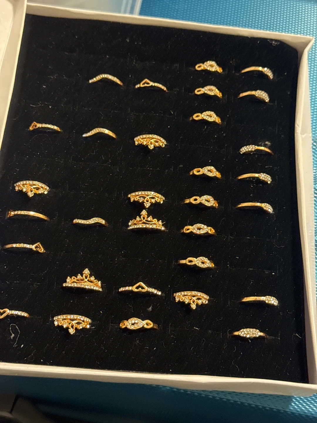 Selling a set of gold-coloured rings in various designs. They're in great condition and come in a box to keep them organized. Perfect for adding a touch of sparkle to any outfit!