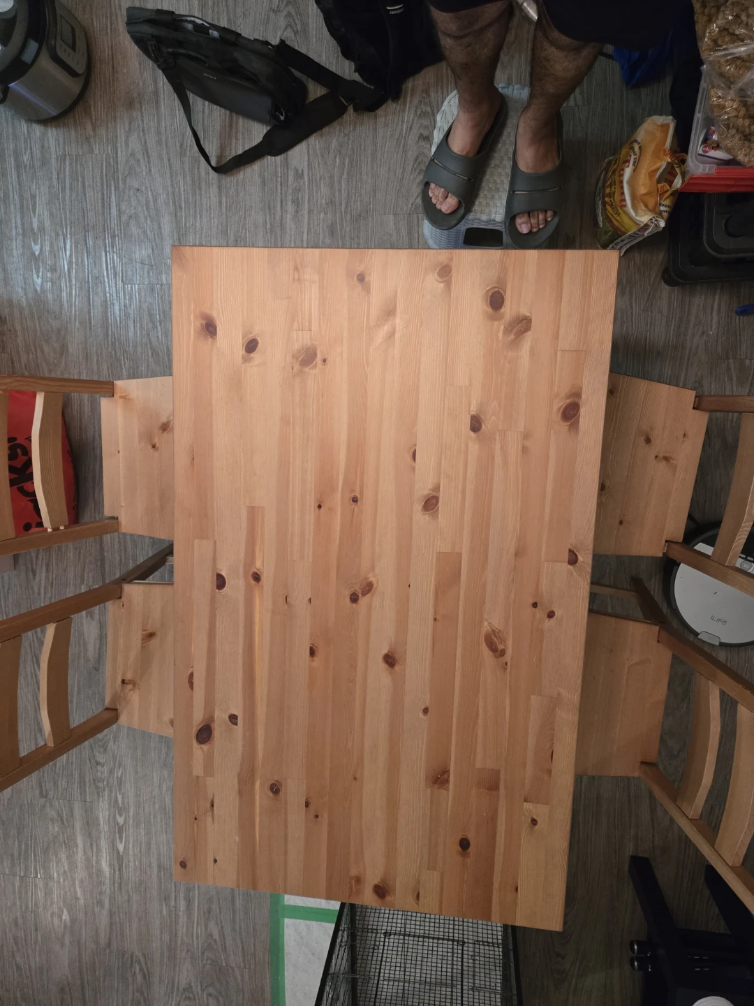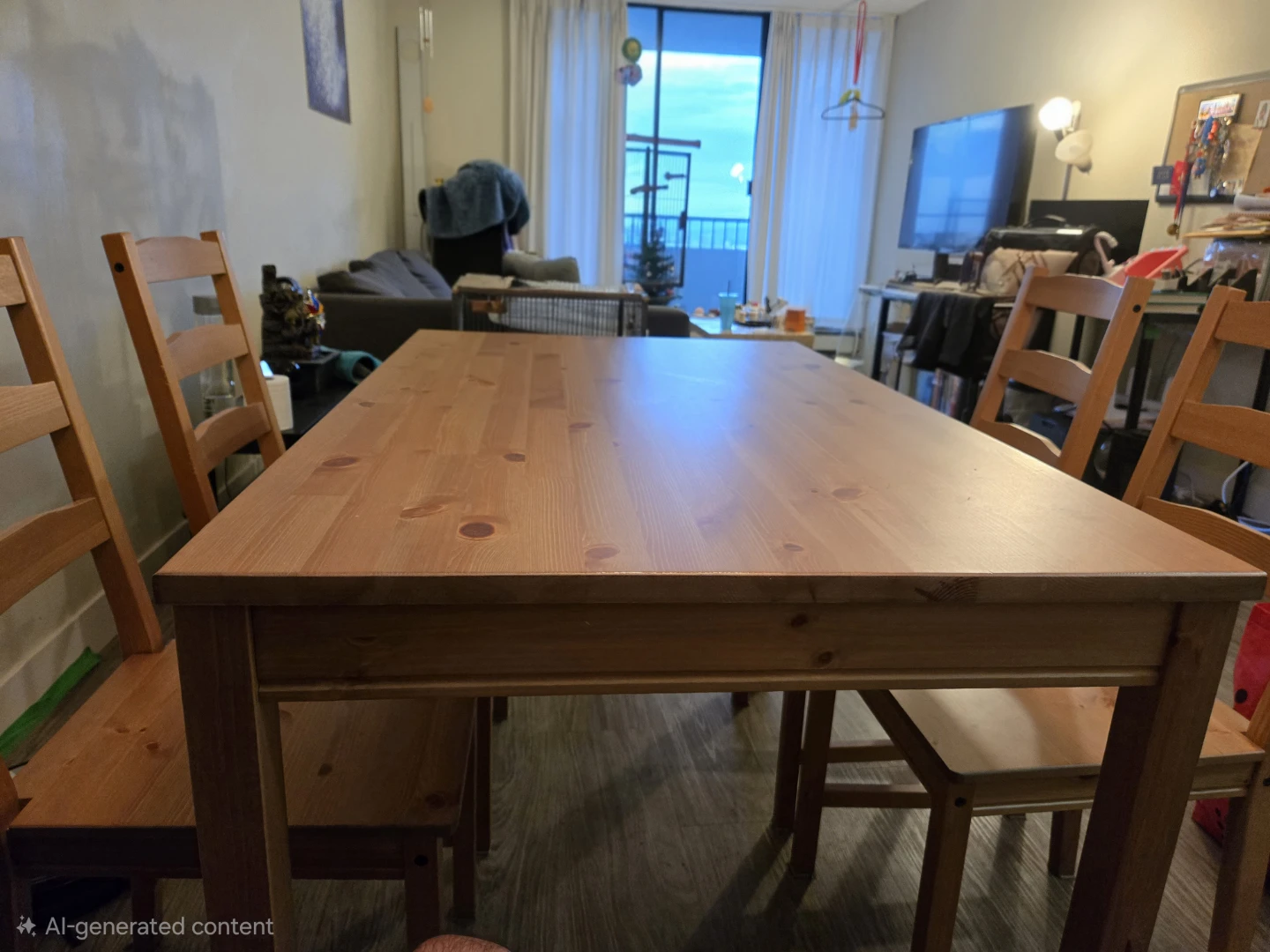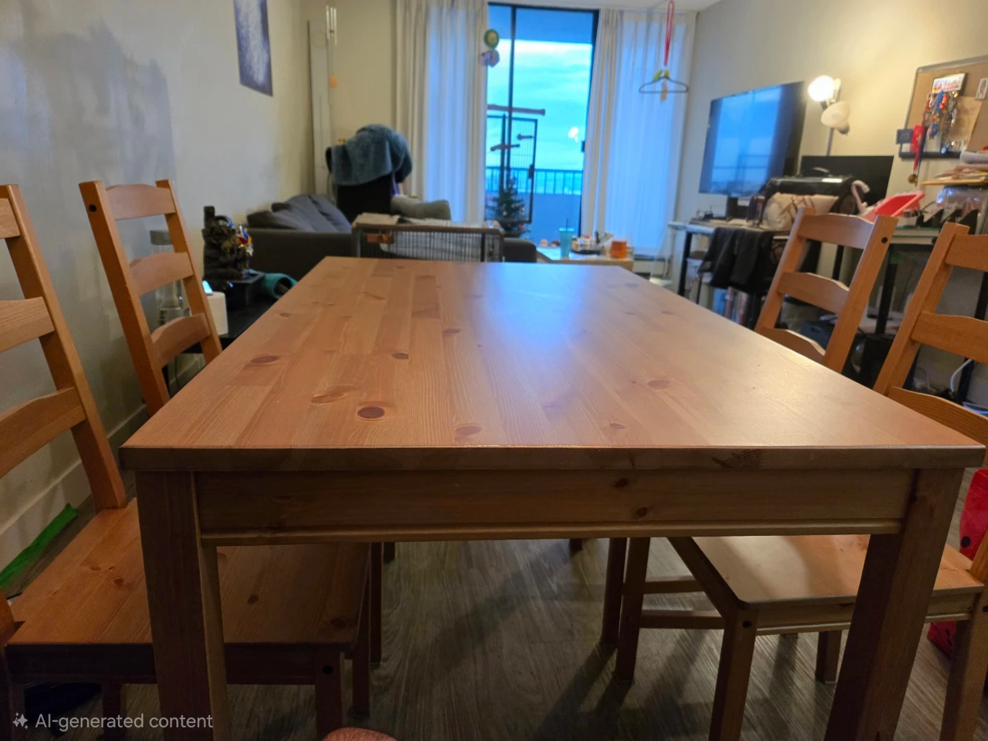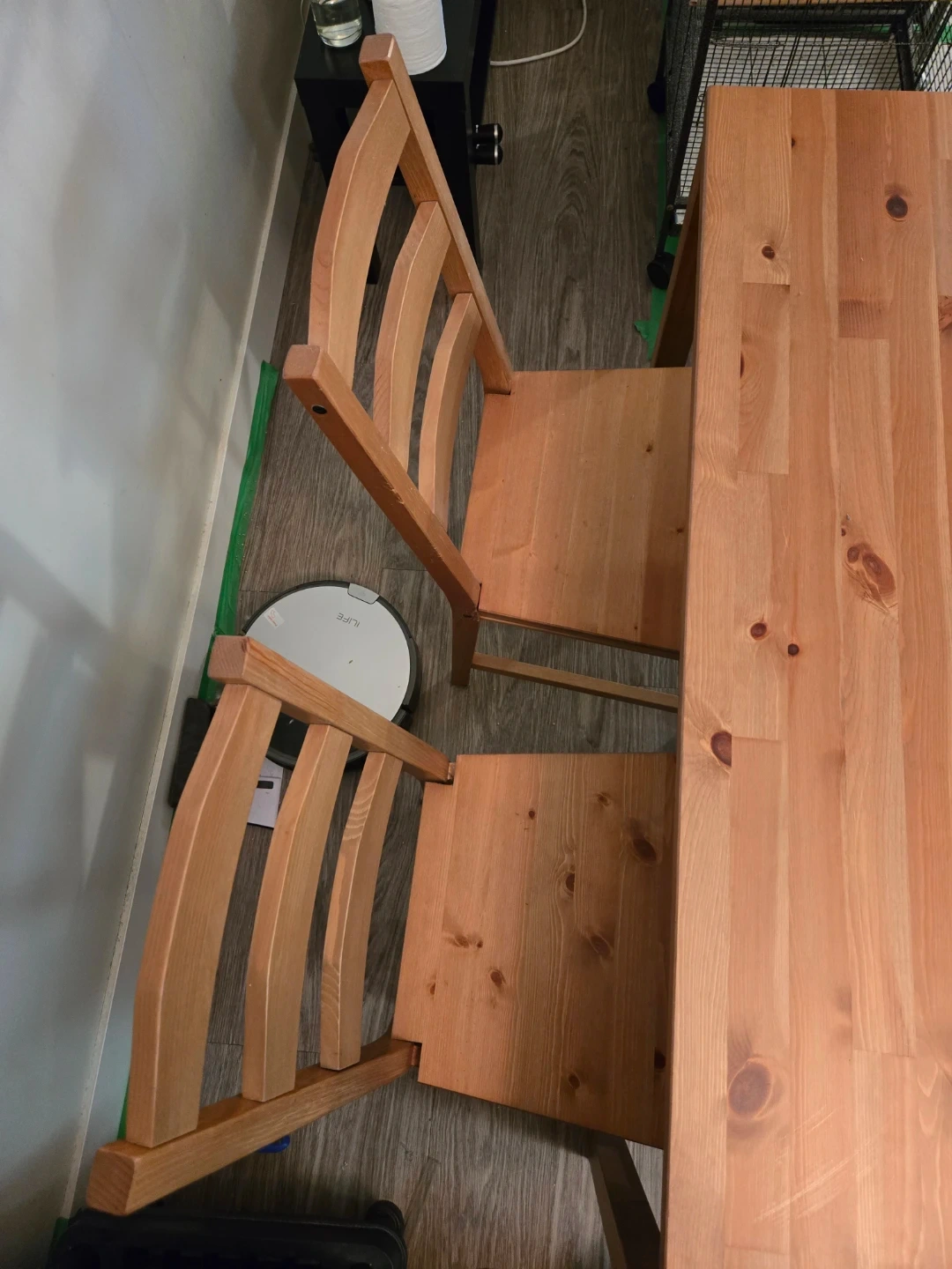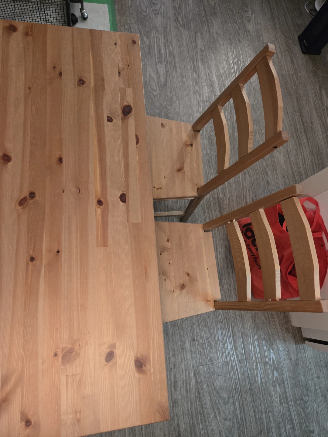 Selling a solid pine dining table with four matching chairs from IKEA. It's in good condition and ready for a new home! Perfect for a small dining area or kitchen.