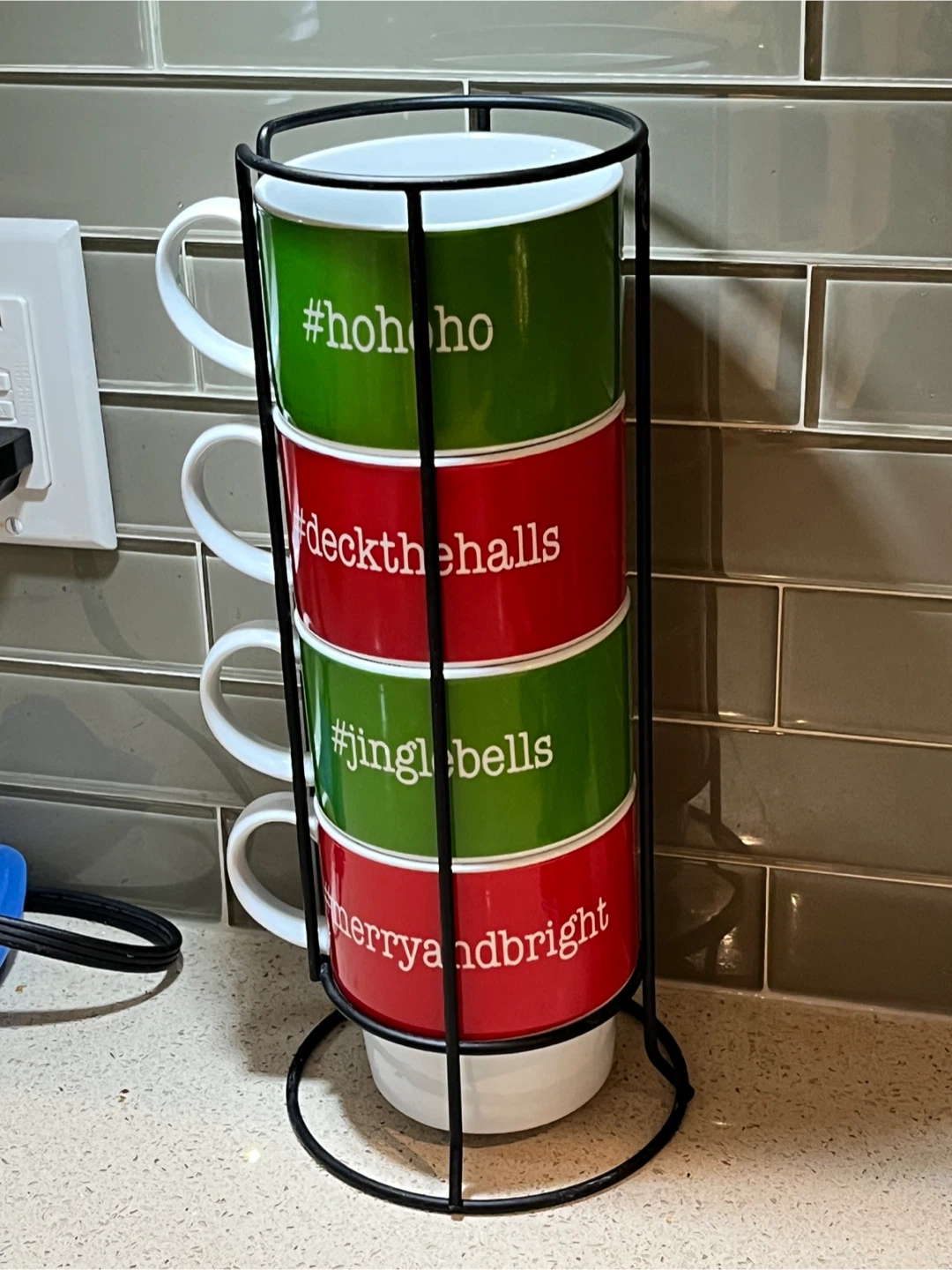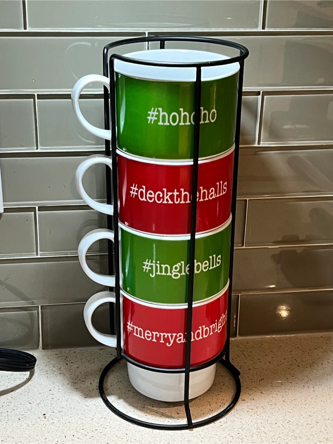 Here's a set of four Christmas mugs, perfect for the holiday season! They come with a handy stand for easy storage and display. Each mug has a different festive saying: #deckthehalls, #hohoho, #jinglebells, and merryandbright. They're in great condition and ready to bring some cheer to your morning coffee or evening cocoa