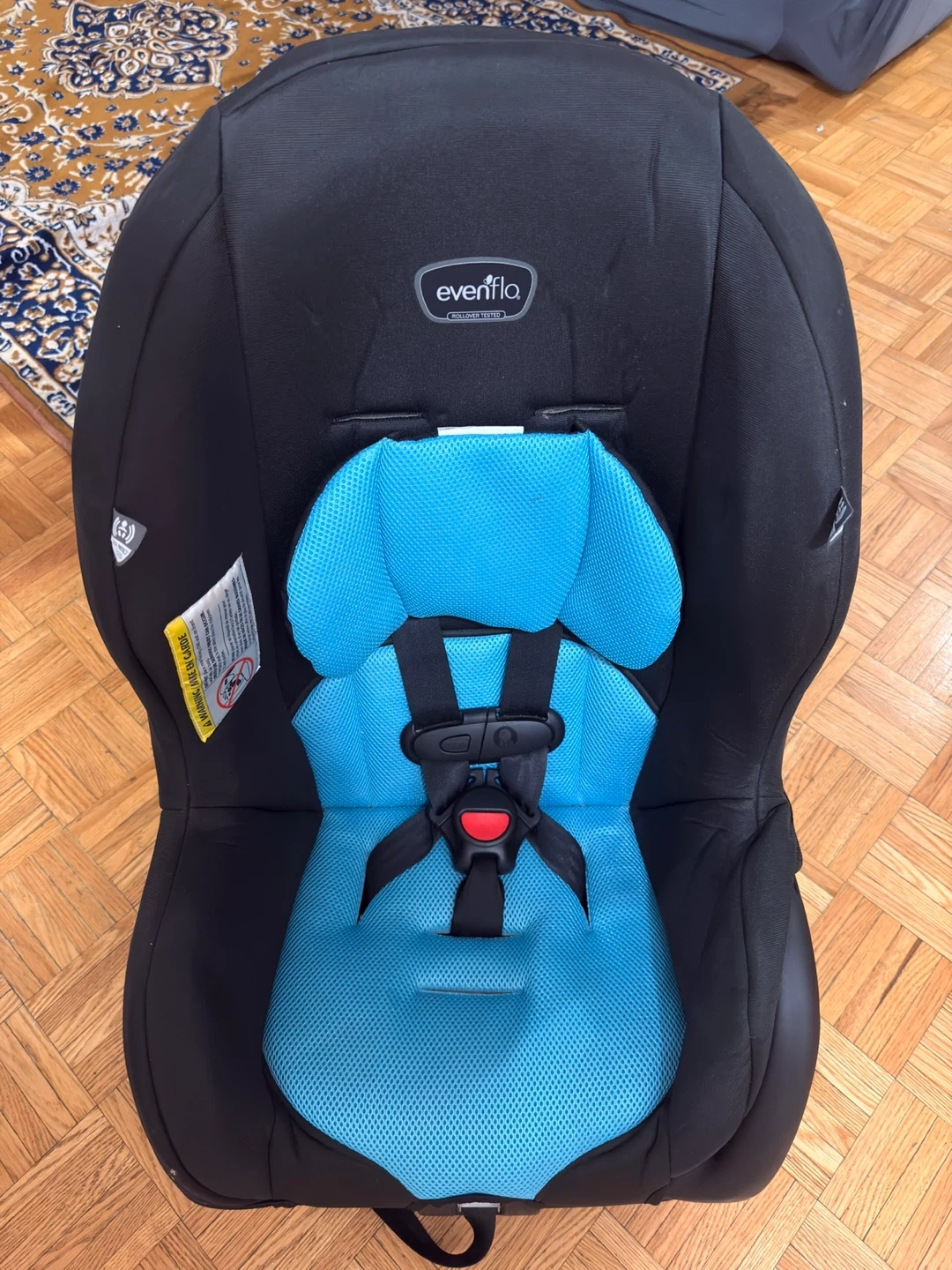 Selling an Evenflo Tribute child restraint system. This car seat is suitable for rear-facing (2.3 to 18 kg or 5 to 40 lbs) and forward-facing (10 to 18 kg or 22 to 40 lbs) positions for children at least 2 years old. The head pillow is made of 100% polyester fiber, and the pad consists of 60% polyurethane foam pad and 40% polyester fiber