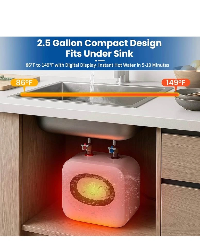 2.5 Gallon Mini Tank Electric Water Heater, 1500W 110V/120V, Under Sink Water Heater with Digital Display & Pressure Relief Valve, Hot water heater for Kitchen Bathroom RV Camper, Includes 2 Hoses