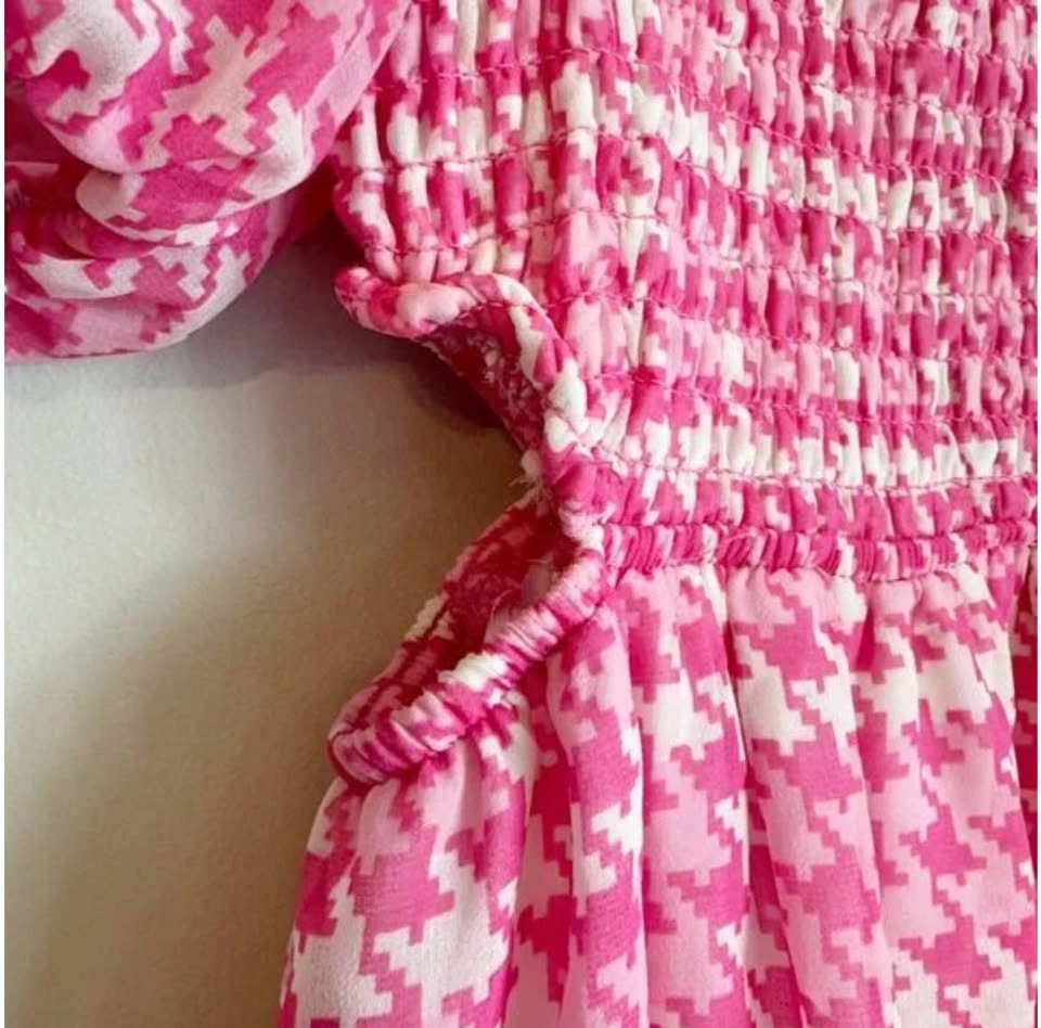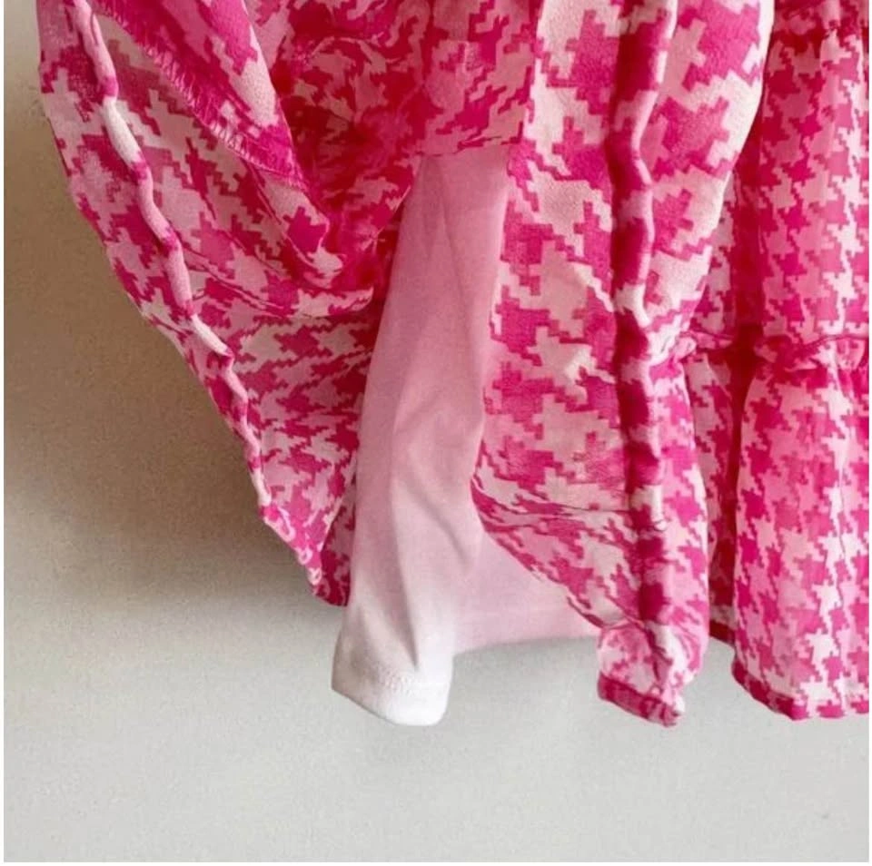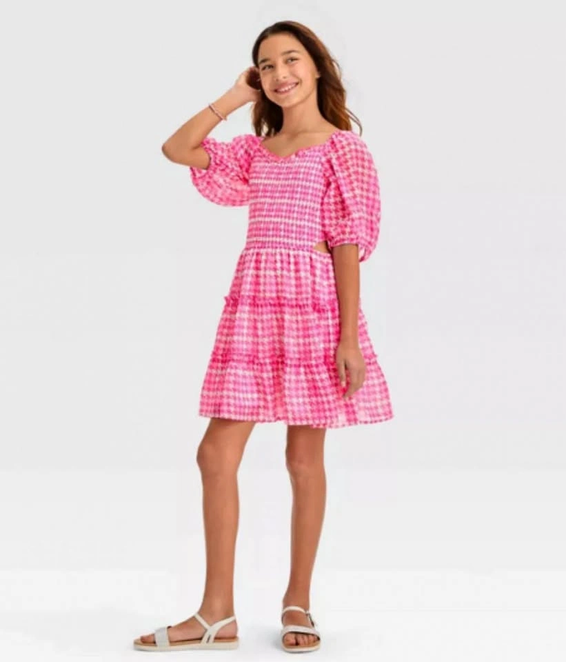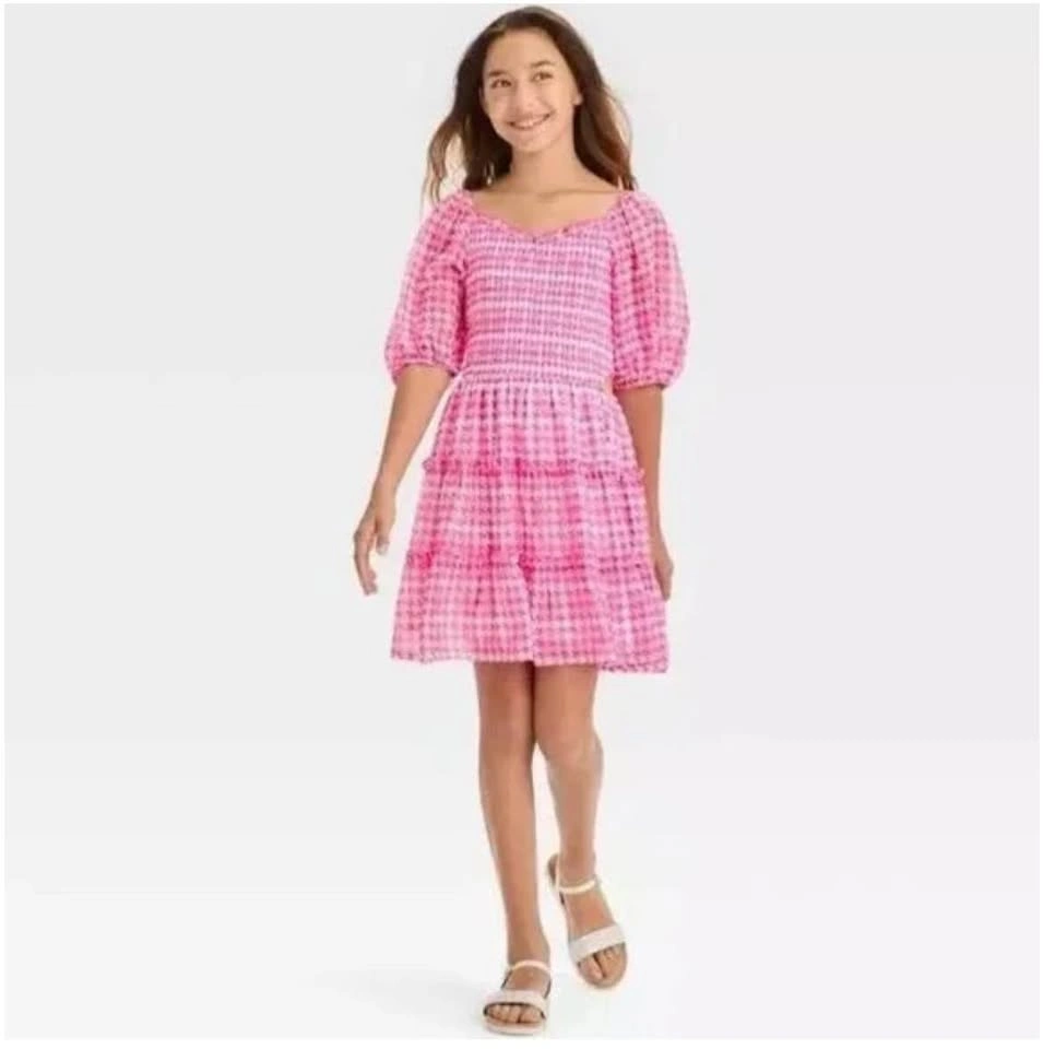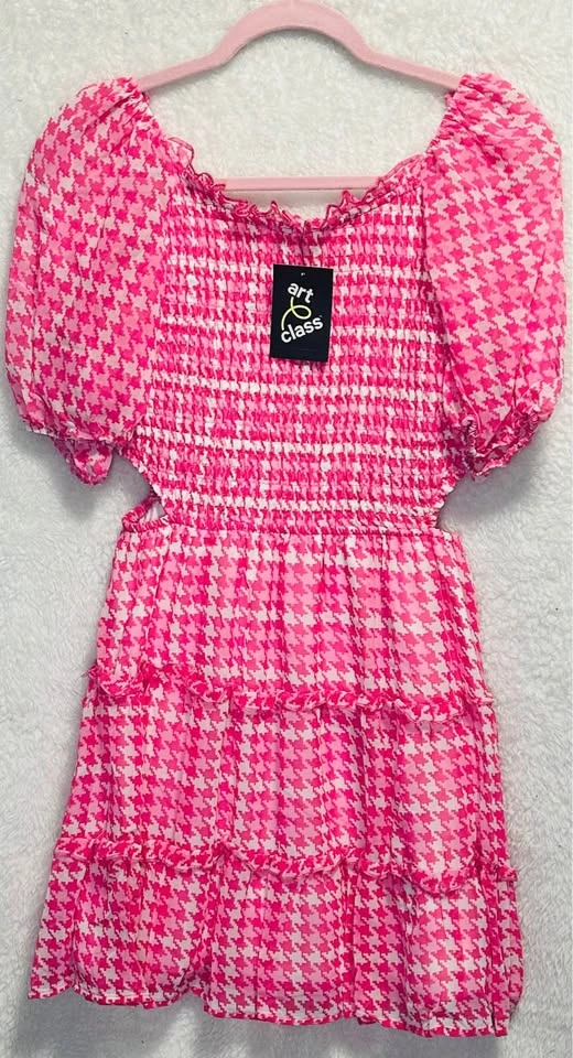 109The NWT Target Girls Smocked Bodice Chiffon Cut Out Dress in size XL 14 is a stylish and summery outfit perfect for young girls. The pink chiffon dress features a cute ruffle accent and a smocked bodice, giving it a charming and girly touch. With a midi dress length and suitable for machine washing, this versatile dress is ideal for summer and spring occasions. Made by the brand Art Class, this dress is a must-have for any fashion-forward girl's wardrobe.