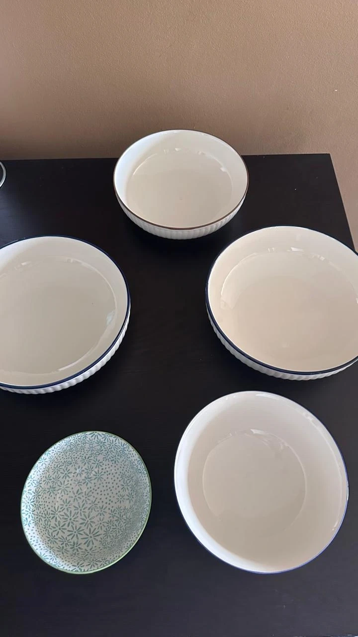 Selling a set of five assorted decorative bowls. There are four white bowls with blue rims, and one smaller bowl with a blue and green floral pattern. They're perfect for adding a touch of charm to your kitchen or dining area!
