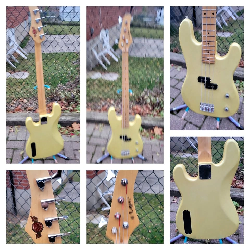 This bass has maple neck, maple fretboard, split single-coil(noiseless) pickup, and vol/tone controls. It's a great platform to upgrade from if you are looking to upgrade its pickups, which I can do for you in the future at no extra charge.