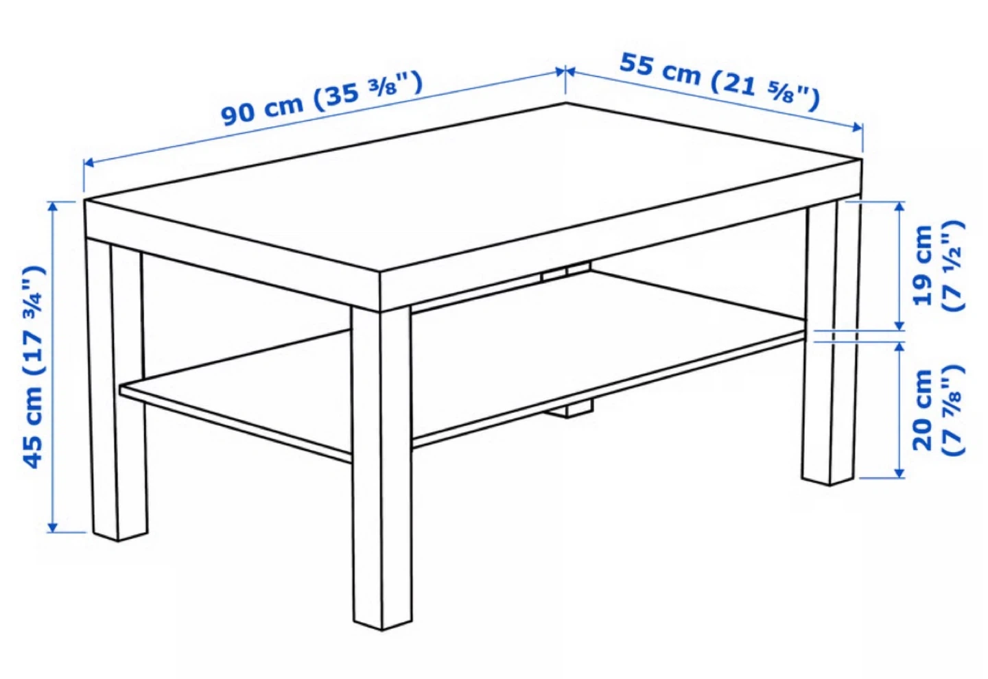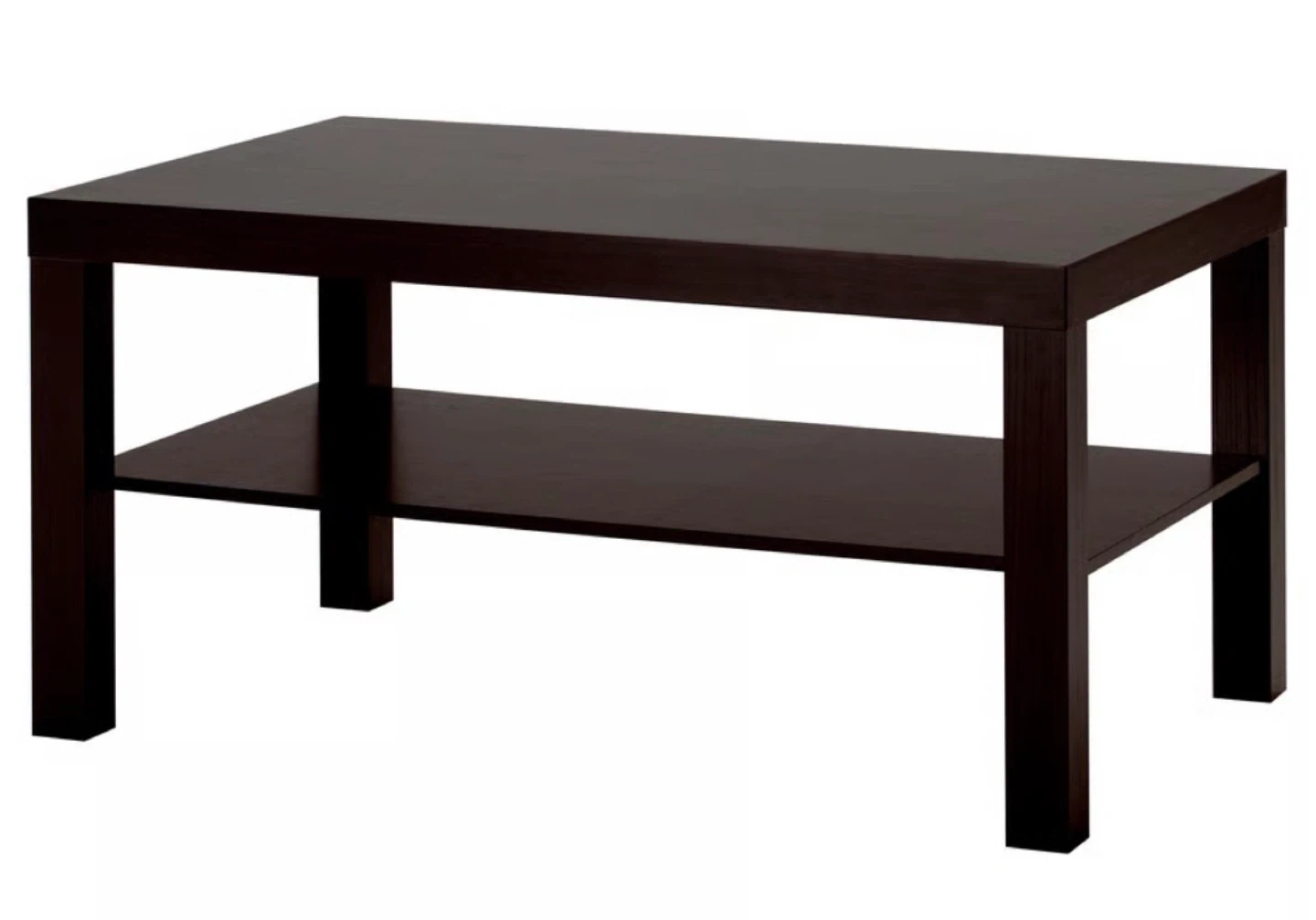 Selling an IKEA Lack coffee table in black-brown. It's a simple and sturdy table with a convenient shelf underneath for storage. Dimensions are 90cm x 55cm, and it stands 45cm tall. Perfect for any living room! Recently bought (2 months ago). Like new with no spots or scratches). House has no pets/no smoking.