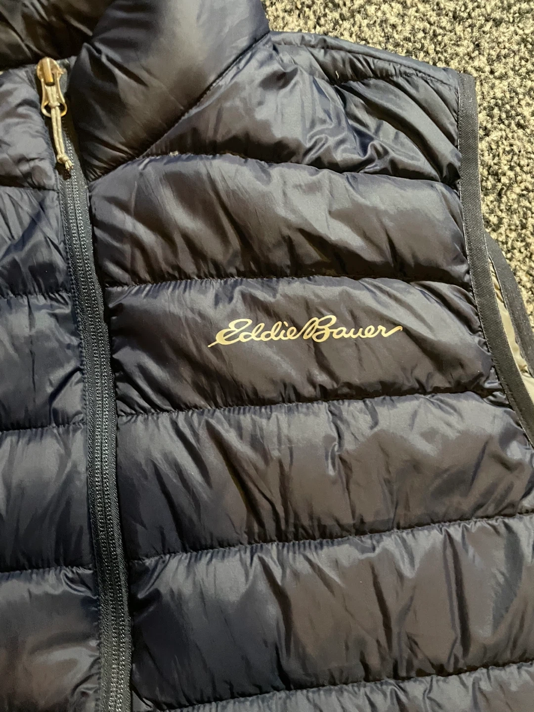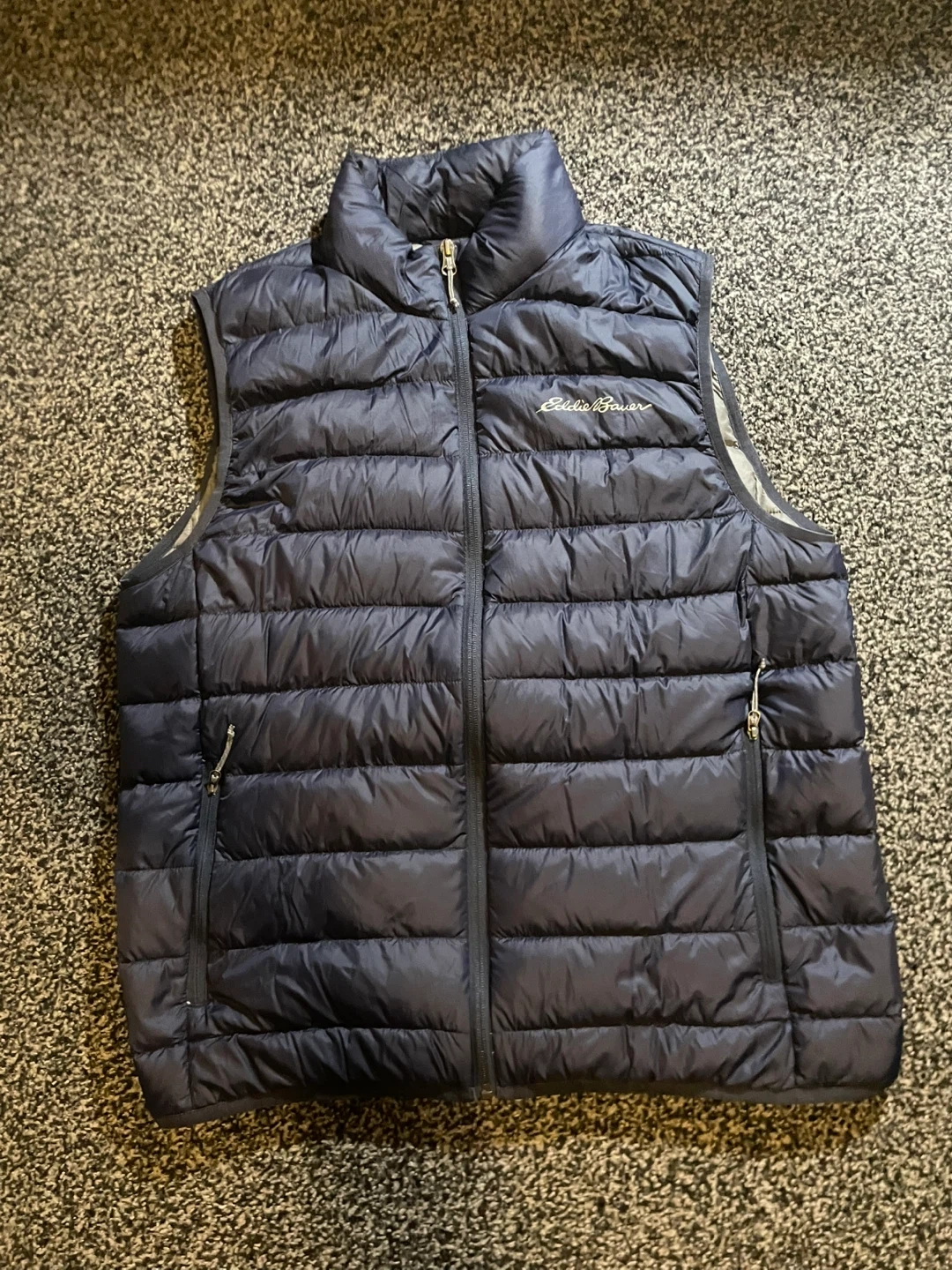 Selling an Eddie Bauer EB650 down vest. It's in great condition and perfect for layering during those chilly Canadian days! The vest is a stylish navy blue colour. The vest is in good condition, has 2 inside pockets inside and 2 zippered pockets on the outside! The jacket is still very puffy, smoke and pet free! Size men’s medium!
