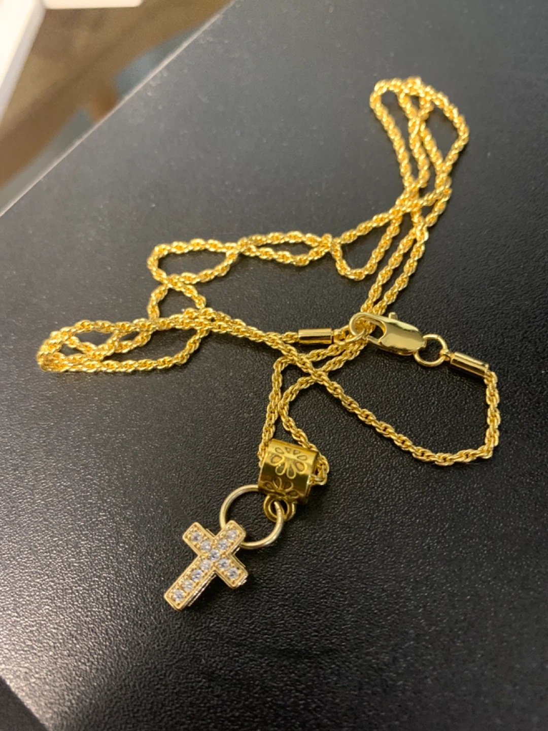 Selling a lovely gold tone 925 necklace with a cross pendant. The chain is a delicate rope style, and the cross is adorned with small, sparkly stones. It's in great condition and ready to add a touch of elegance to your look!