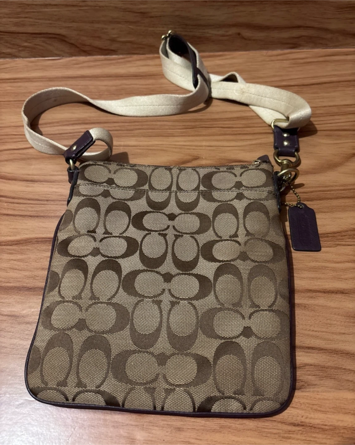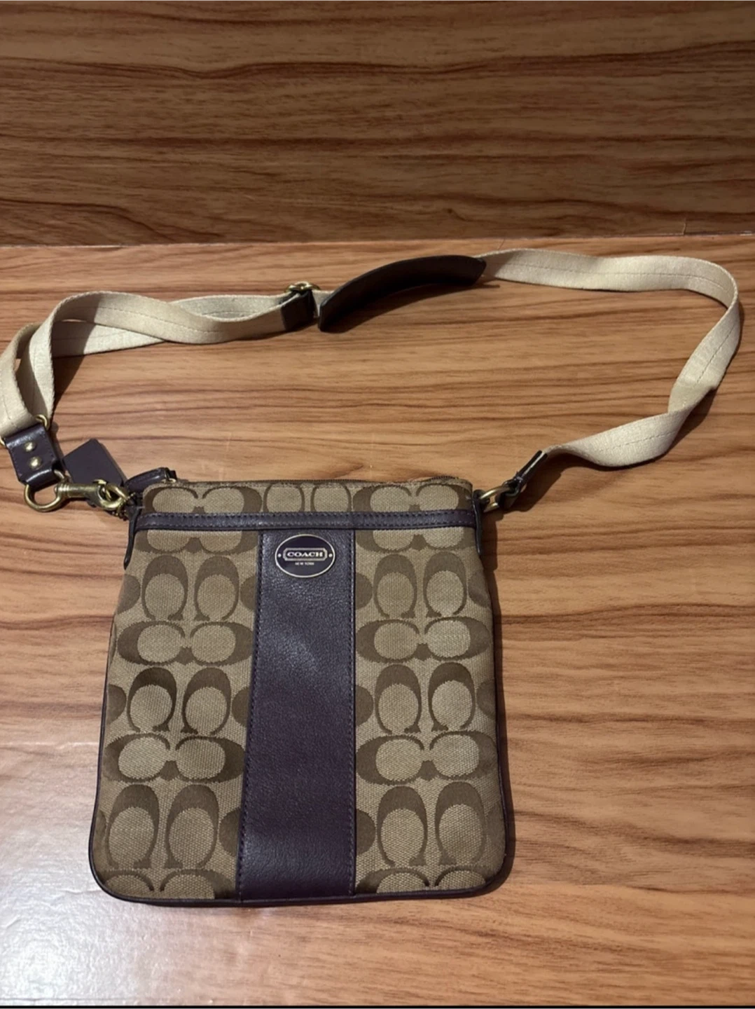 I'm selling a stylish Coach crossbody bag, perfect for keeping your essentials organized on the go! This bag is in good condition and features the classic Coach pattern with a dark brown leather stripe and trim.