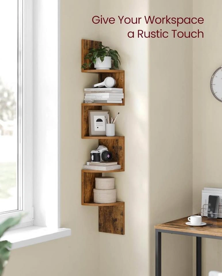 Add style and storage to any room! This floating corner shelf is perfect for books, plants, décor pieces, and more. Its rustic brown finish blends beautifully with bedrooms, living rooms, bathrooms, or your home office.