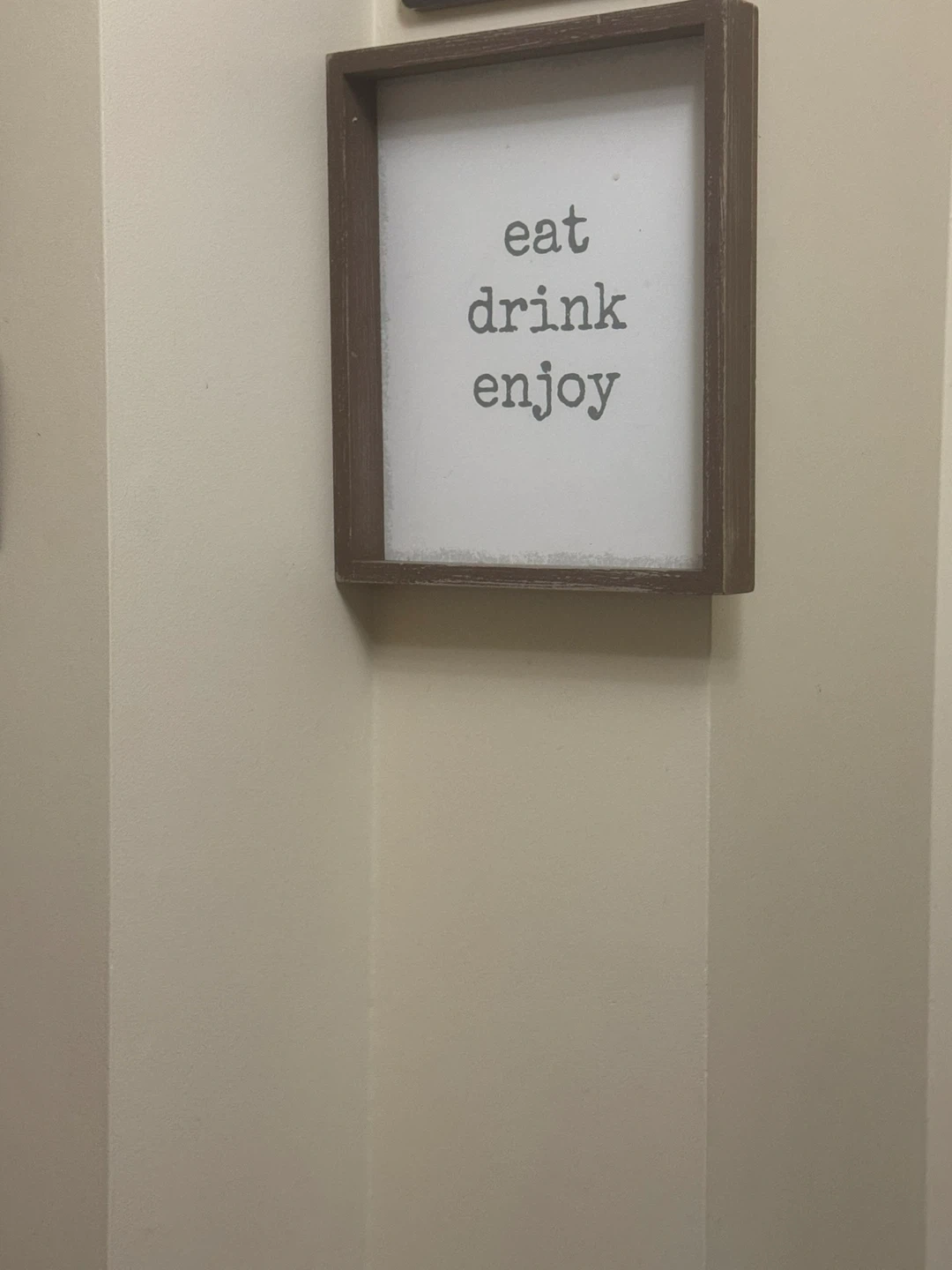 A charming framed piece of wall art that says "eat drink enjoy"! Perfect for adding a touch of warmth to your kitchen or dining area, this piece is sure to bring a smile to your face and create a welcoming atmosphere