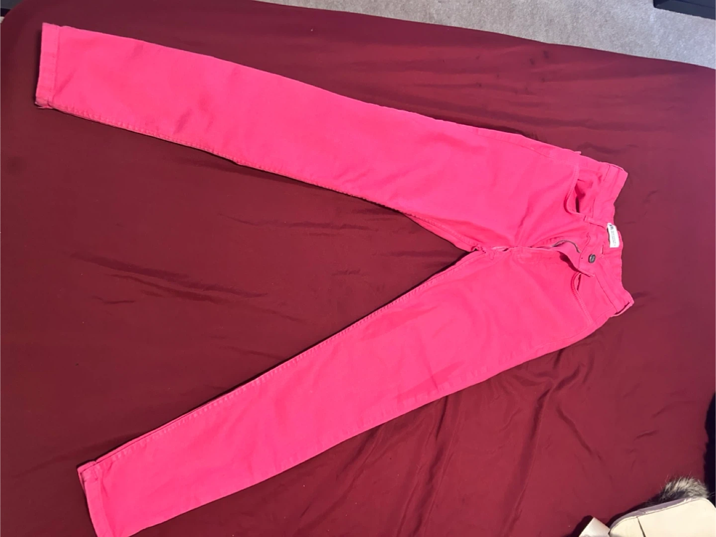 Selling a pair of bright pink pants! They're in great shape and ready for a new home. Worn once and since I gain muscle mass tried it on and does not fit a result of that there is a strip in the front stream (not torn) it can be sowed