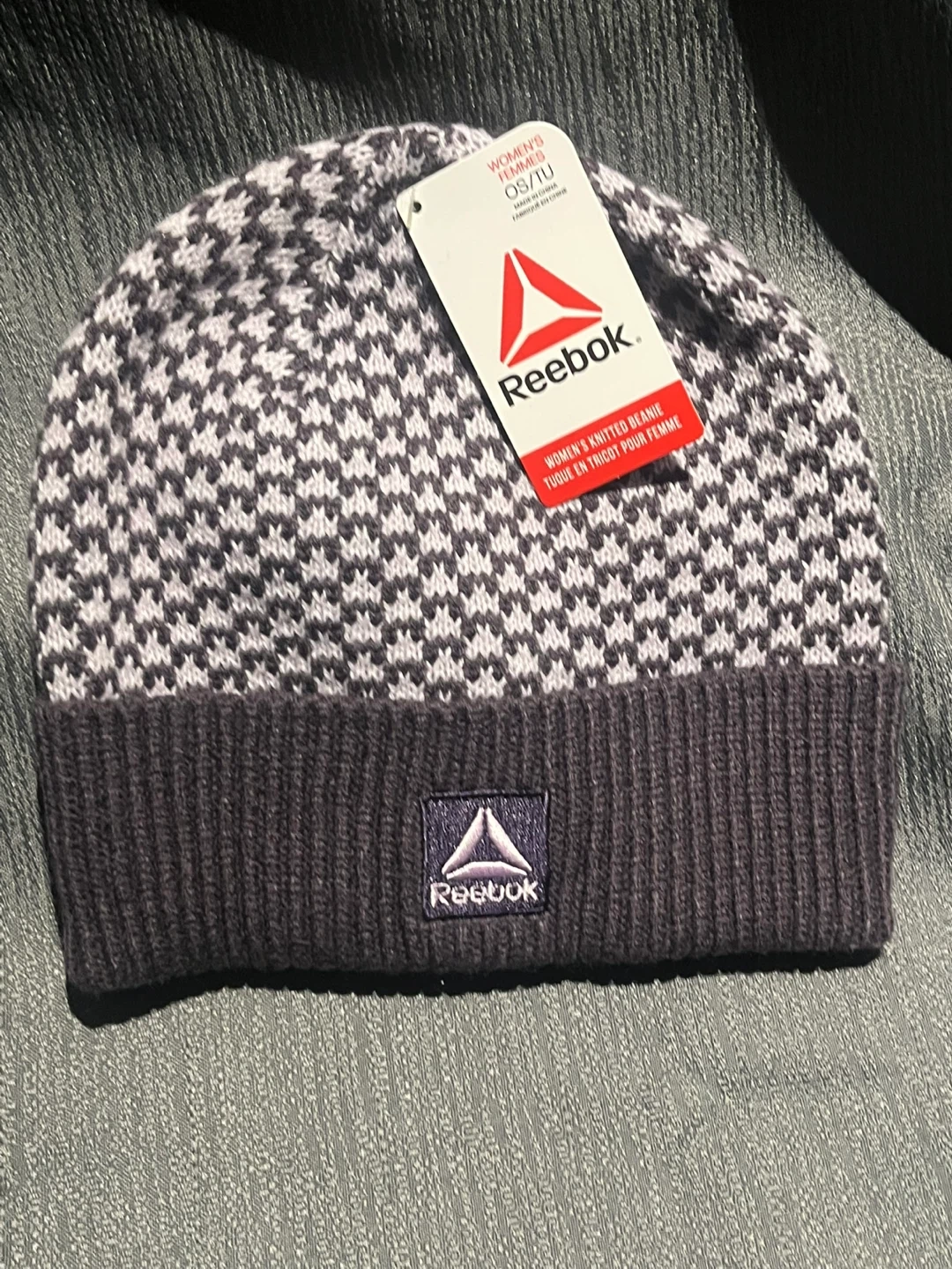 1000+Check out this brand new Reebok women's knitted beanie! It features a stylish houndstooth pattern in grey and white, with a dark grey ribbed brim. The Reebok logo is subtly displayed on the front. Perfect for keeping warm and looking great this winter!
