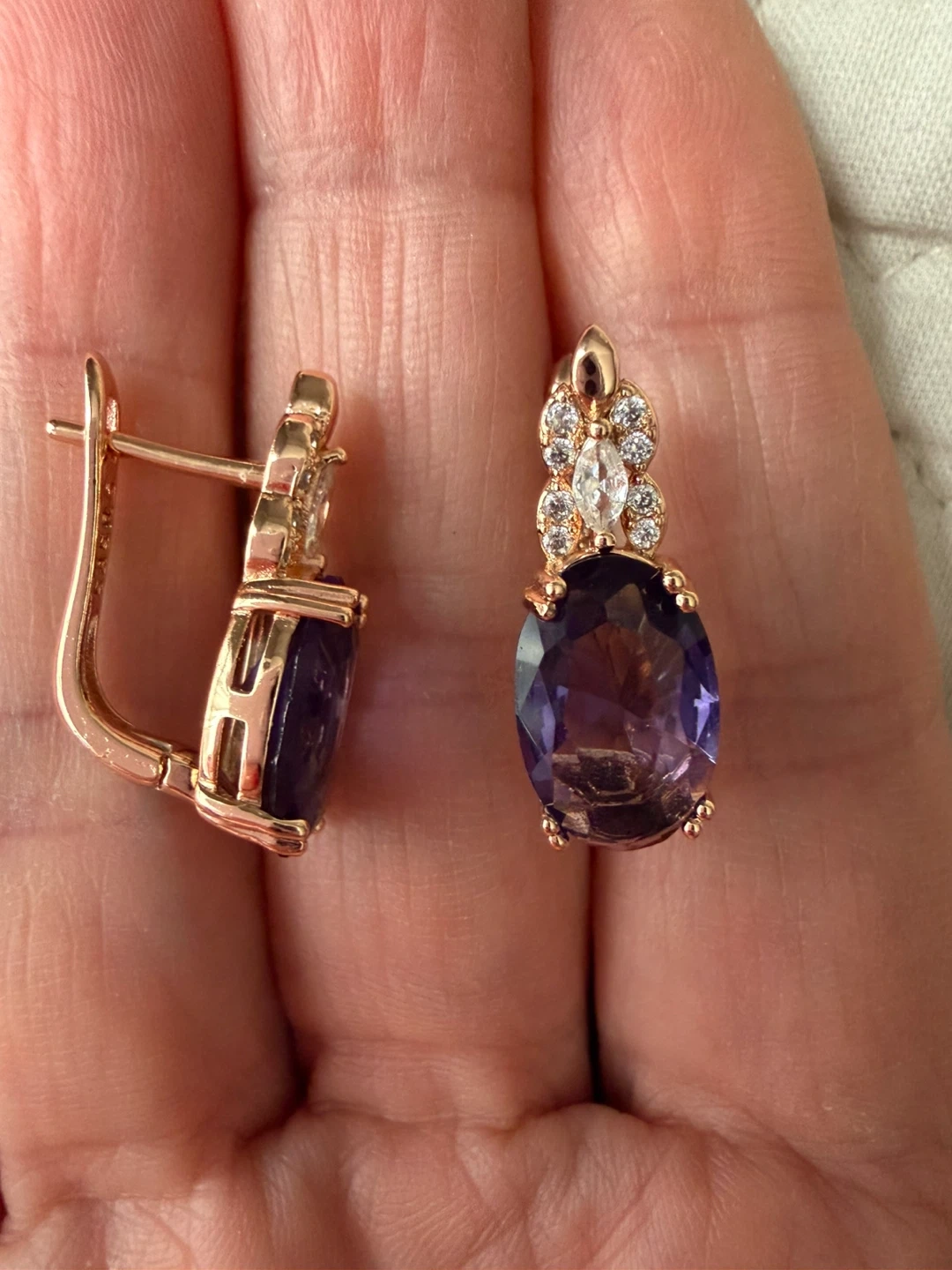 Beautiful pair of earrings featuring an oval amethyst stone surrounded by sparkling accents, set in a rose gold tone. These are perfect for adding a touch of elegance to any outfit!