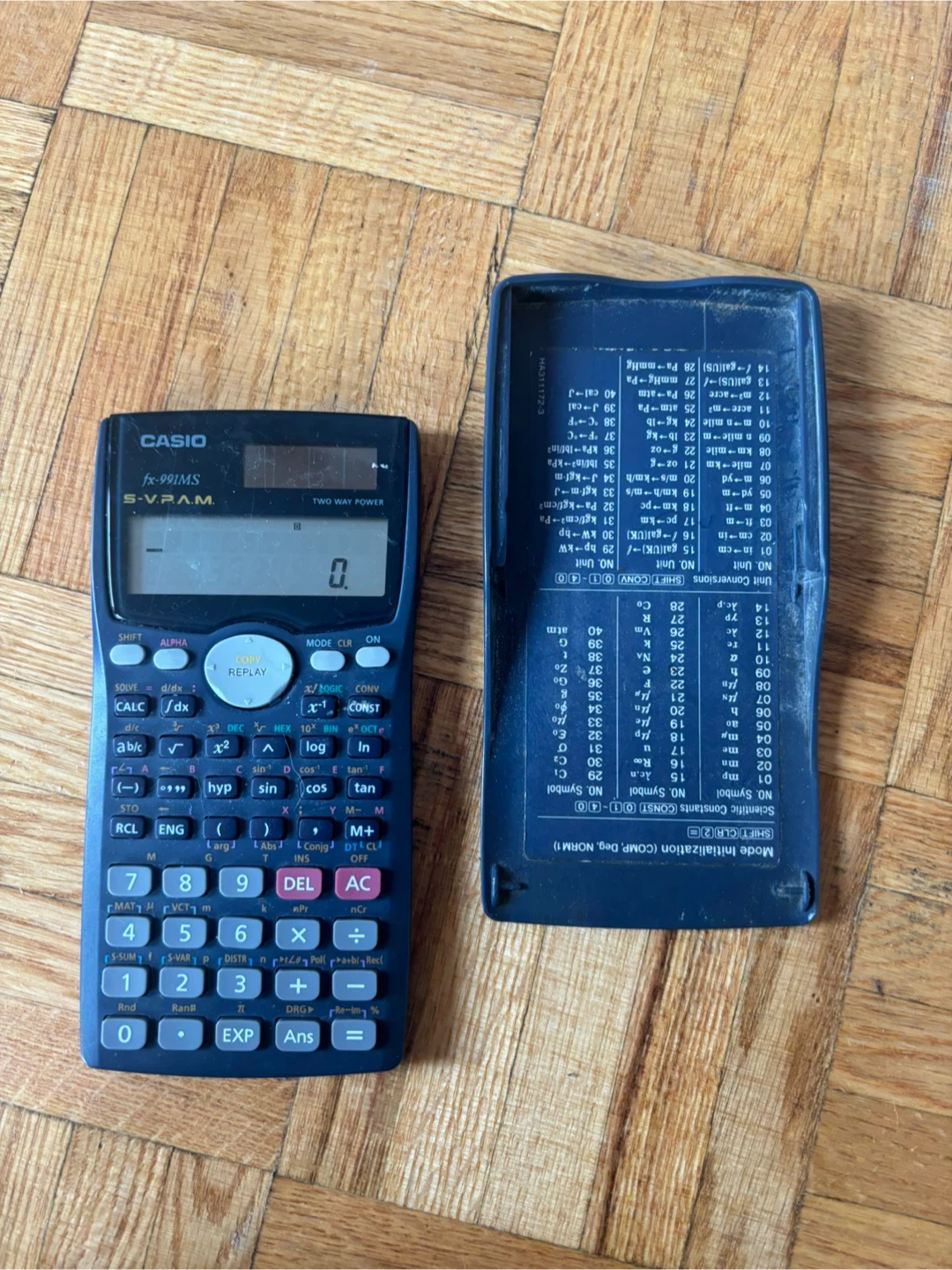 Casio fx-991MS S-V.P.A.M. calculator in good working condition! It comes with its protective case, which also has some useful unit conversions listed inside