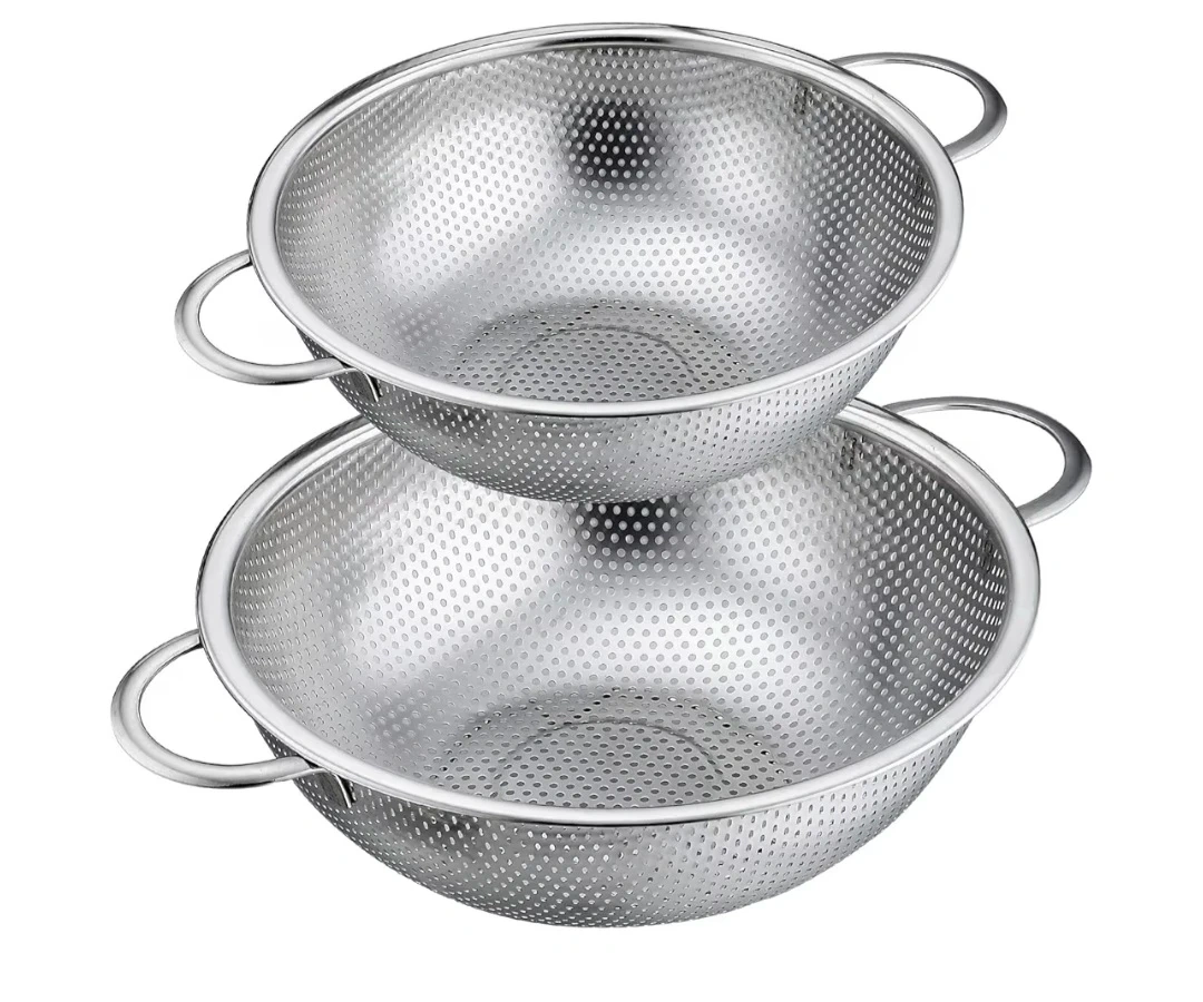Selling a P&P Chef colander set in great condition! This set includes two stainless steel micro-perforated food strainers with handles. The sizes are 8.8 inches and 11.2 inches. They're perfect for washing, rinsing, and draining fruits, vegetables, and pasta. Dishwasher safe and non-toxic!