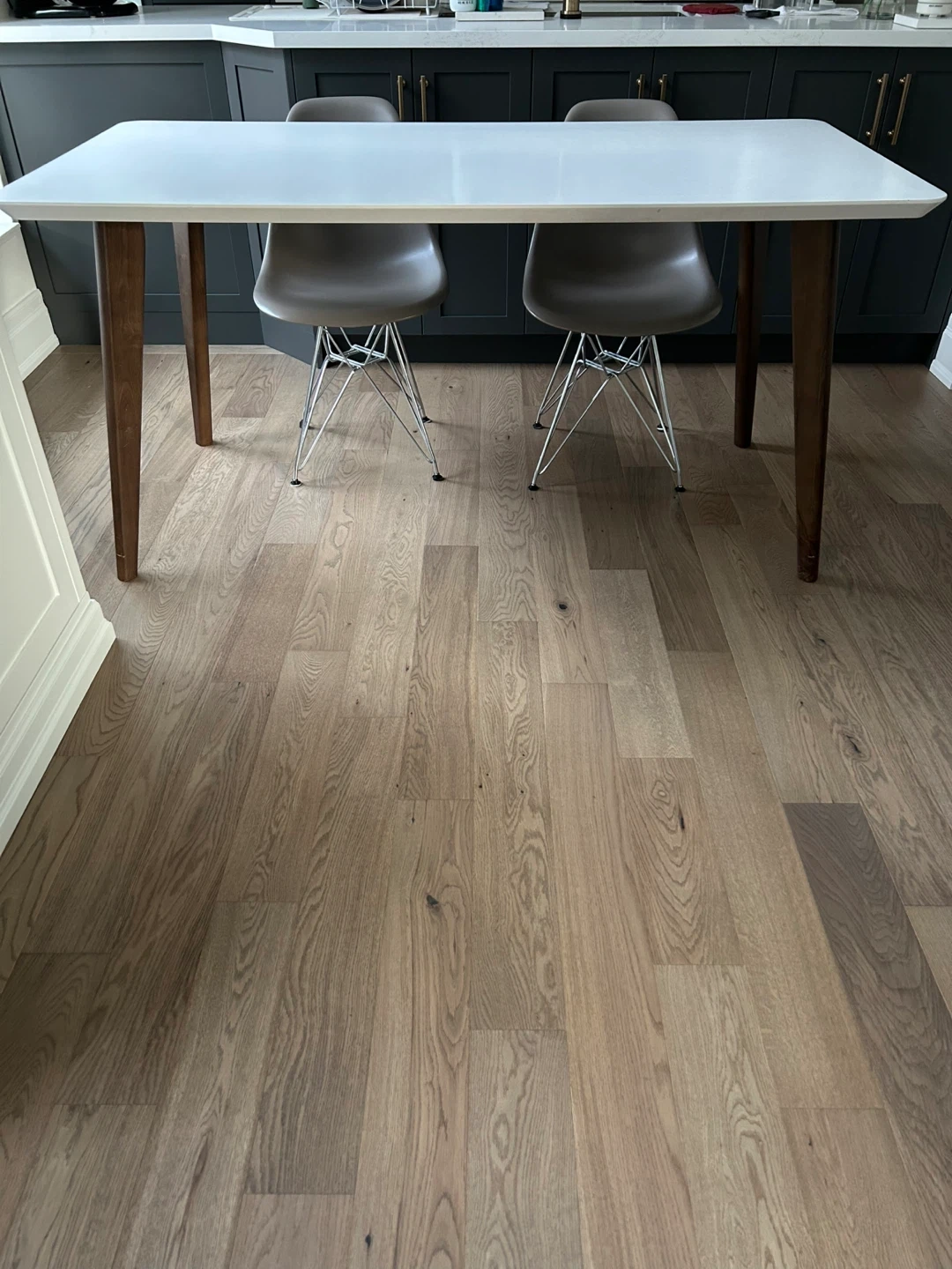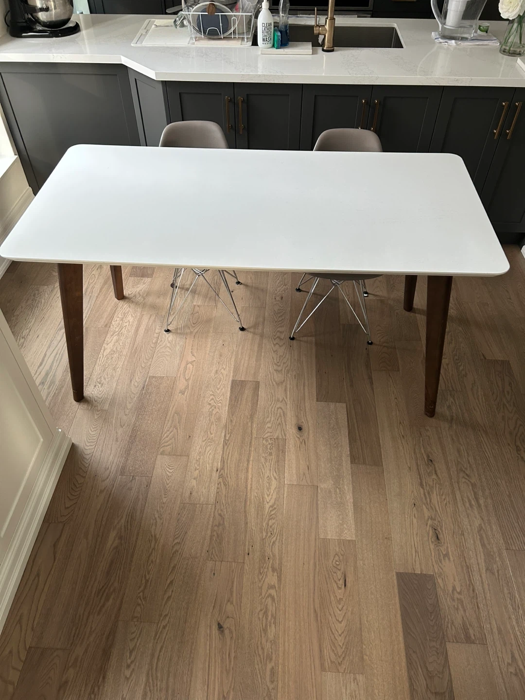 MDF dining table with White painted oak veneer top and dark solid ash legs.
