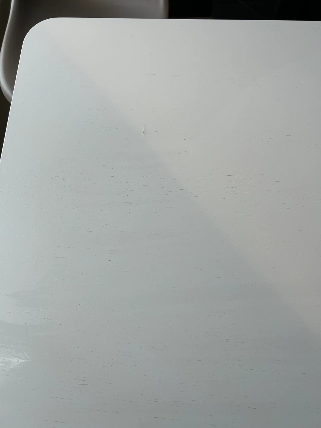 Great condition. There are minor scratches (mostly on leg) and a very hard to see stain (2nd last pic) as per the photos. The table has natural wood grain pattern on top.