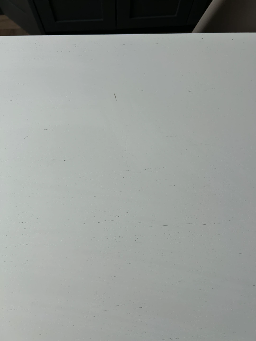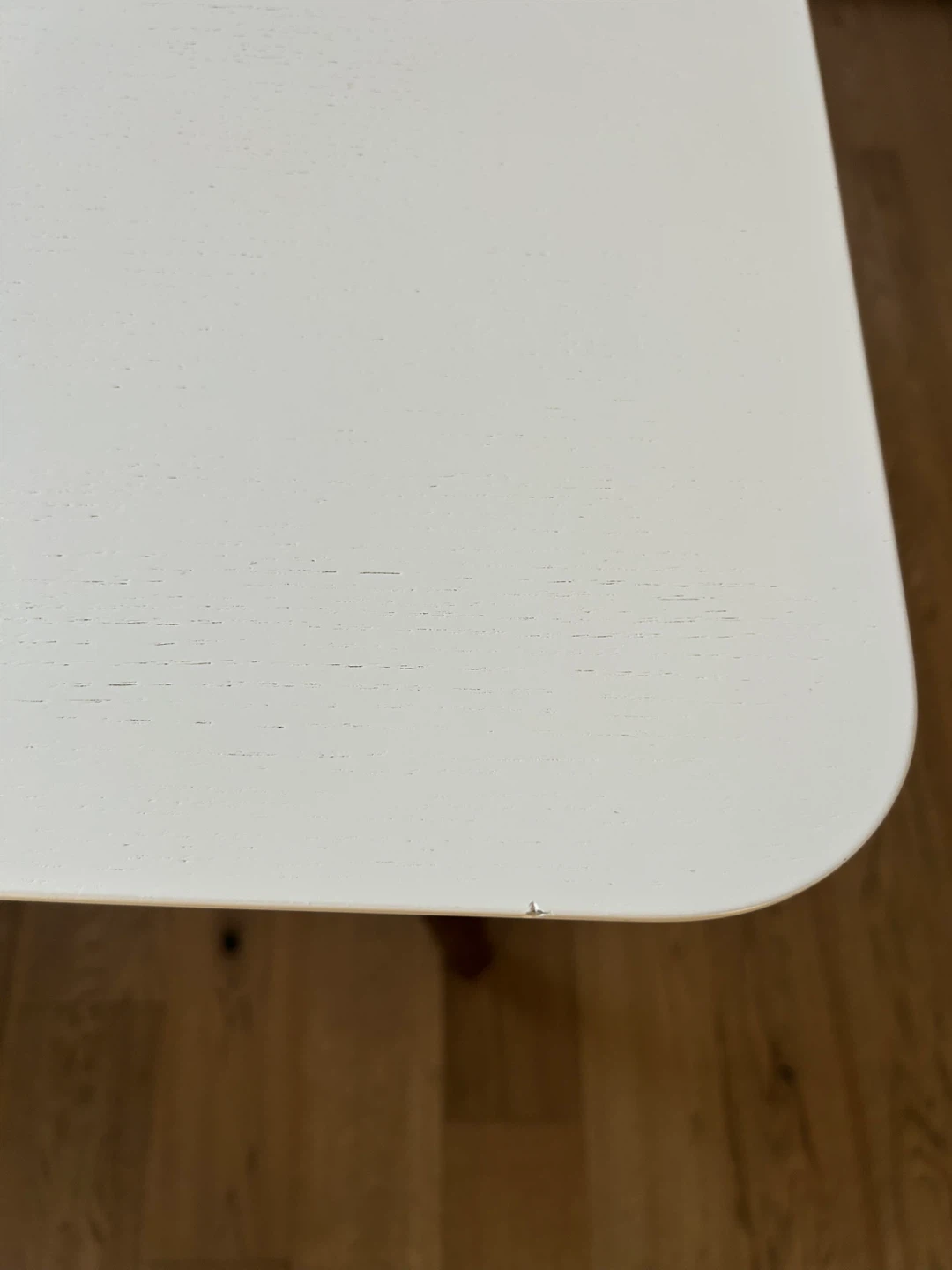 Great condition. There are minor scratches (mostly on leg) and a very hard to see stain (2nd last pic) as per the photos. The table has natural wood grain pattern on top.