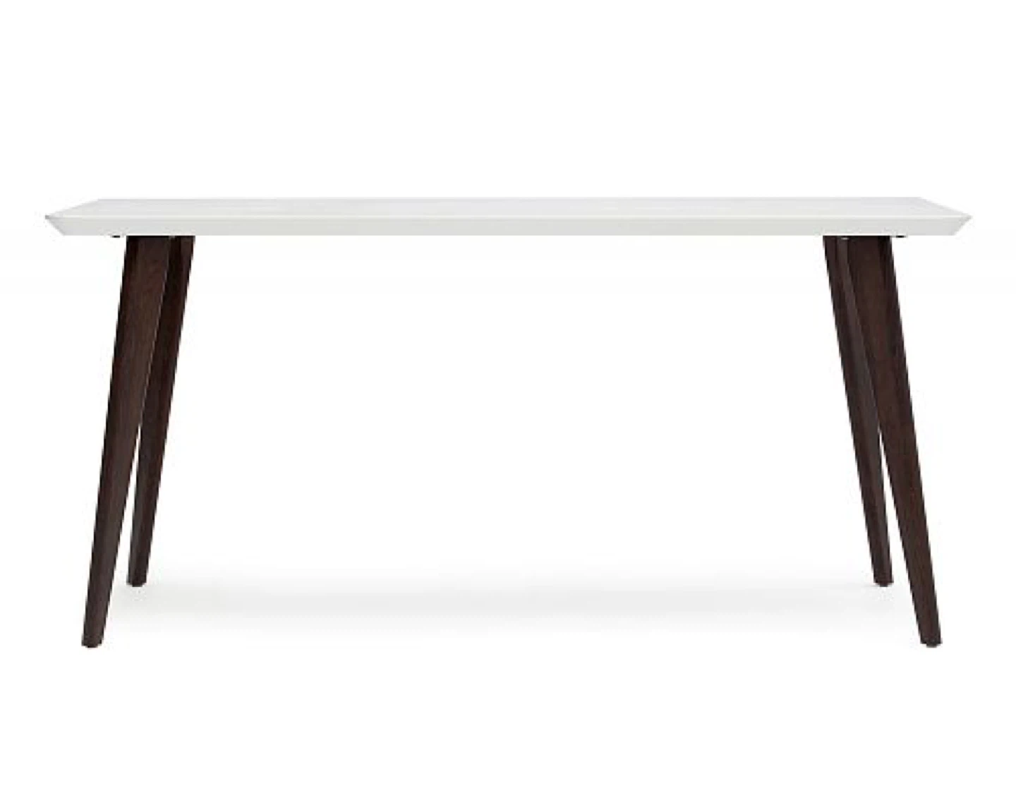 MDF dining table with White painted oak veneer top and dark solid ash legs.