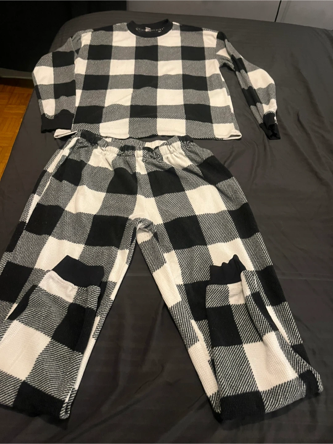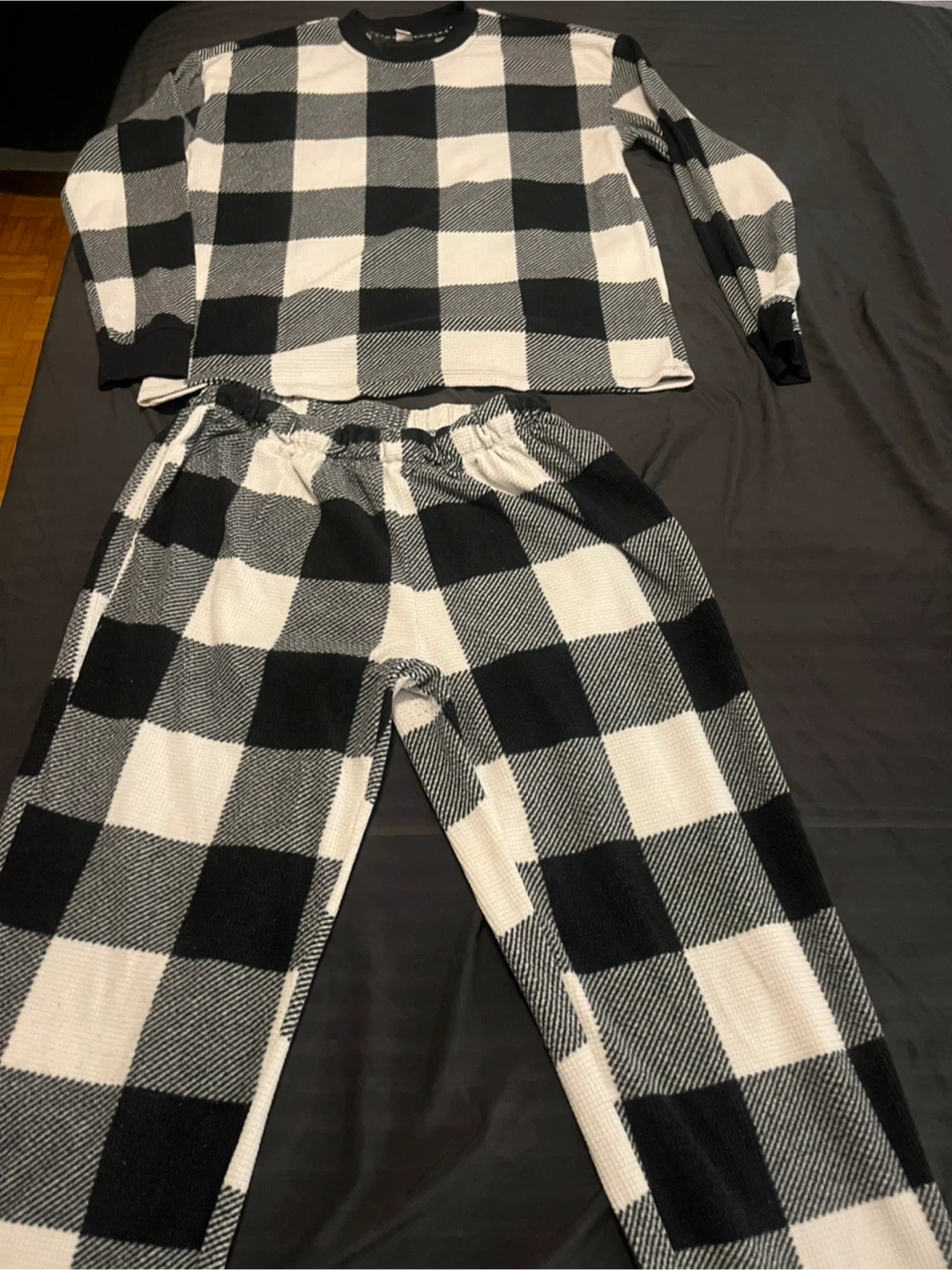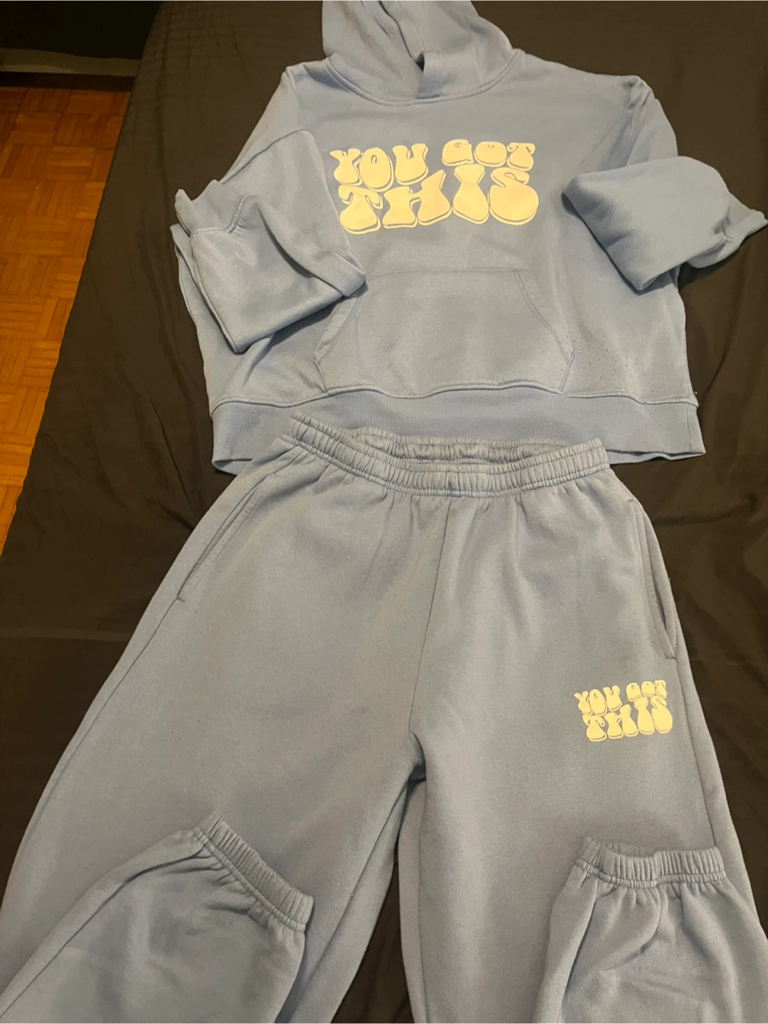 I have two matching lounge sets for sale! One is a black and white checkered pattern size small and the other is a light blue set with the words "You Got This" on it, size medium. Both are in great condition and super comfy for lounging around at home. $15 per set.