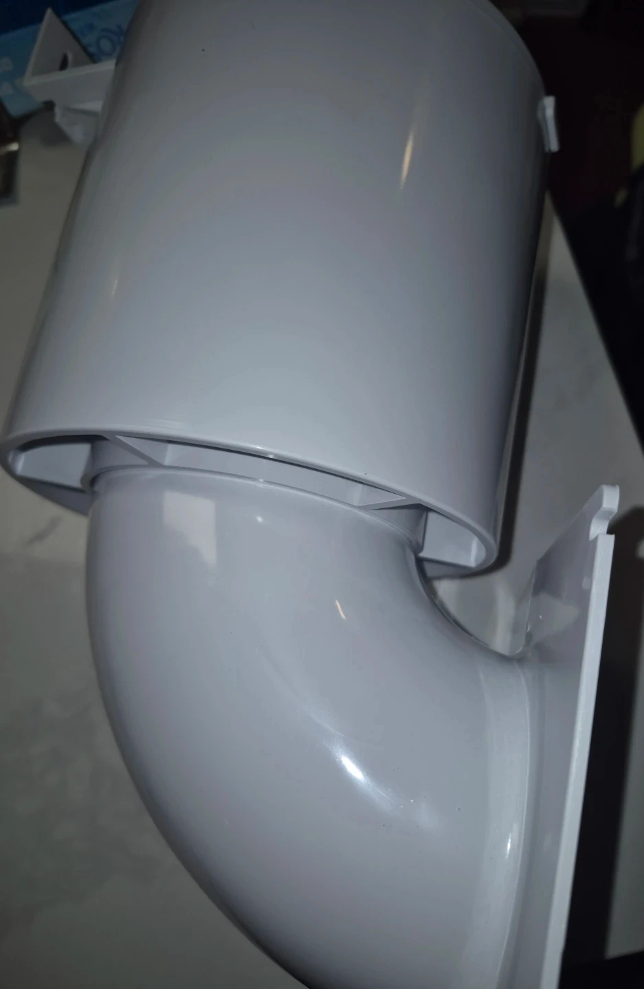 This is a white dryer vent cover. It's designed to prevent air leaks and improve dryer efficiency. The dimensions are approximately 7 inches in height and 6.25 inches in width. It also features a floating cup design that allows air to escape when the dryer is working and closes the vent when the dryer is off
