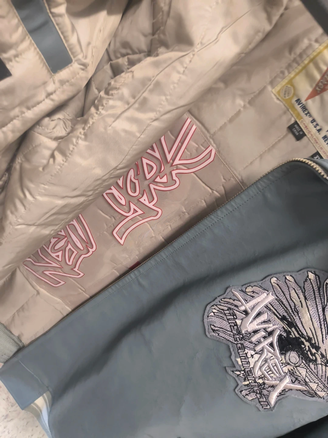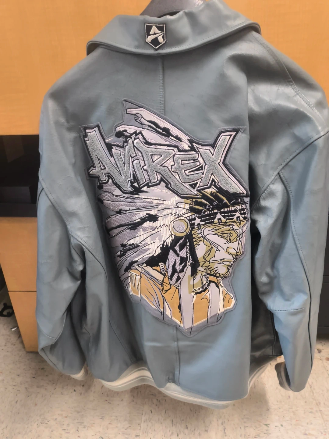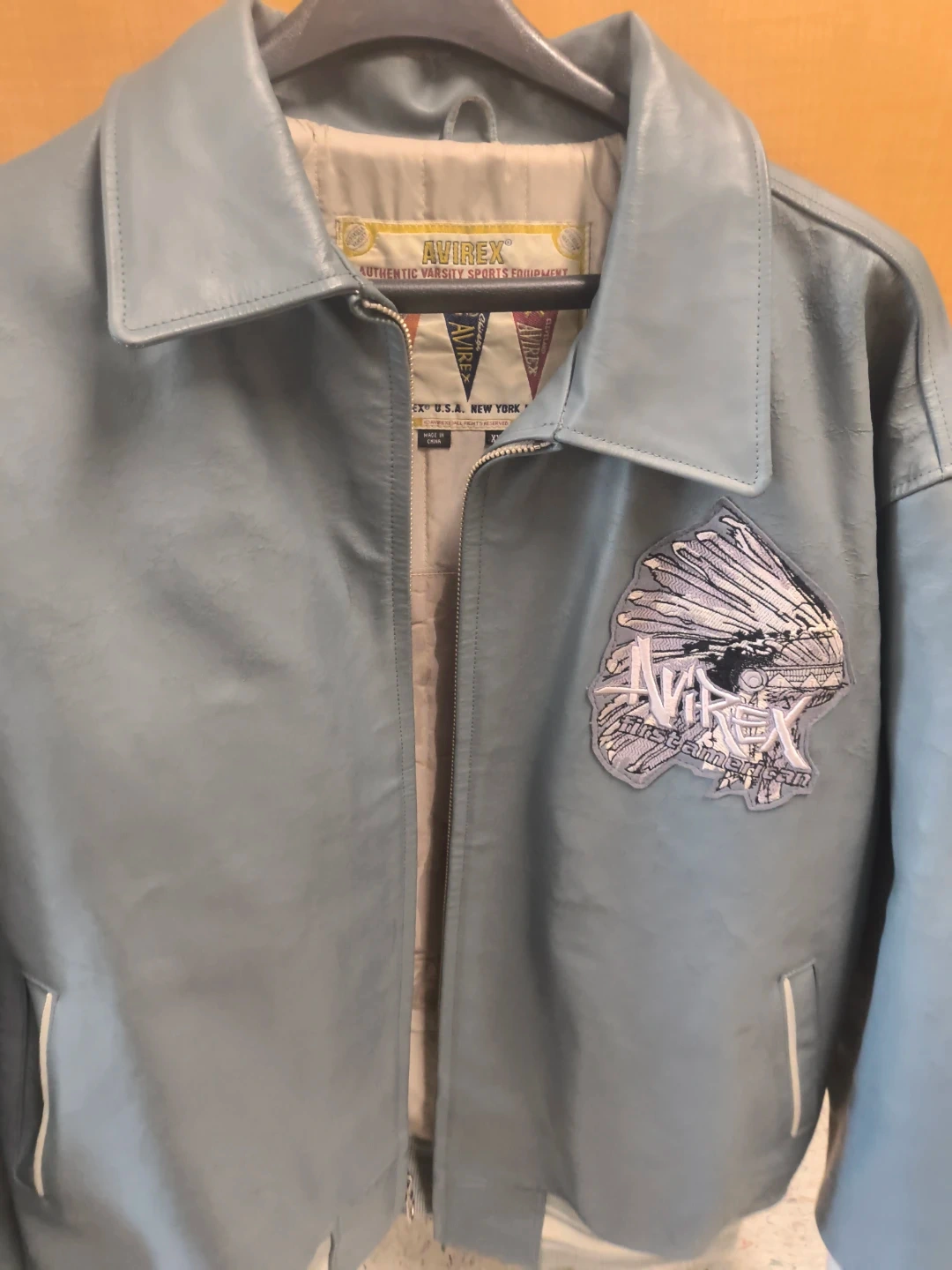 Selling an Avirex jacket with a cool design on the back. It's a varsity sports equipment style jacket. The jacket is a light blue color and features the Avirex logo.