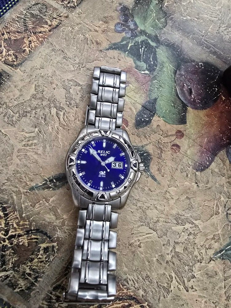 Elevate your style with this elegant and sophisticated Relic Wet Watch for men. The unidirectional rotating bezel adds a sporty touch to the classic and casual design. The blue dial with day/date features is powered by a reliable quartz movement. The stainless steel bracelet with a double-locking fold-over clasp provides a secure fit for wrist sizes up to 8 inches. This round watch is water-resistant up to 50 meters and showcases a polished silver finish. The Relic Wet Watch is the perfect addition to any wardrobe, suitable for all occasions.