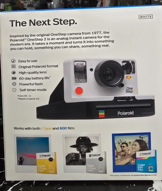 Capture your moments in style with the Polaroid OneStep2 Viewfinder i-Type Camera. This classic white camera is perfect for instant photography enthusiasts who appreciate the timeless design and quality of Polaroid. With its easy-to-use viewfinder, you can easily frame your shots and create memories that will last a lifetime. The Polaroid OneStep2 is a great addition to any vintage camera collection or for those who want to experience the magic of instant photography. Made with the finest materials, this camera is built to last and deliver exceptional results. Camera was just used with film that came with it and no more. Like new. Easy to use: Just point & shoot. Point your target, press the red button and magic will appear . Self-timer function - 60-day battery life: high performance lithium ion battery, 1300mAh, 3.7V nominal Voltage, 4.81Wh High-quality lens: Optical grade Polycarbonate and Acrylic lenses - Fixed focus lens: 0.6m—infinity - Field of view: 41 degrees vertical and 40 degrees horizontal Powerful built-in flash, Flash System: Vacuum discharge tube strobe - Shutter system: Custom design, using precision step motor for shutter One-step 2 camera - USB charging cable - Neck strap - User manual Film Format: Type 600 Model: Viewfinder i-type Type: Instant Brand: Polaroid