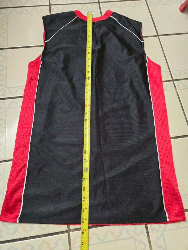 This is a vintage Generation One Athletics Basketball Jersey that is reversible, black in front, red in reverse. It is made of polyester and nylon jersey fabric with a red, black, and white solid pattern. The jersey has a V-neckline and is sleeveless, making it suitable for summer. It is a regular fit and comes in size small. The jersey is easy to care for and can be machine washed. It has no graphic print or personalization and is not subject to California Prop 65 warning. The jersey is part of the Generation One product line and has an athletic and basketball theme.