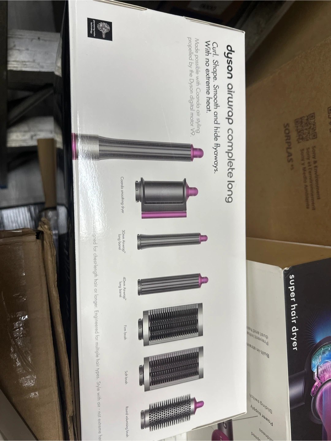 Selling a Dyson Airwrap Complete Long! It helps you curl, shape, smooth, and hide flyaways with no extreme heat. It's made possible with Coanda air styling propelled by the Dyson digital motor V9. Includes attachments like the Coanda smoothing dryer, 30mm and 40mm Airwrap long barrels, firm brush, soft brush, and round volumizing brush. It's designed for chest-length hair or longer and engineered for multiple hair types. Style with air, not extreme heat.