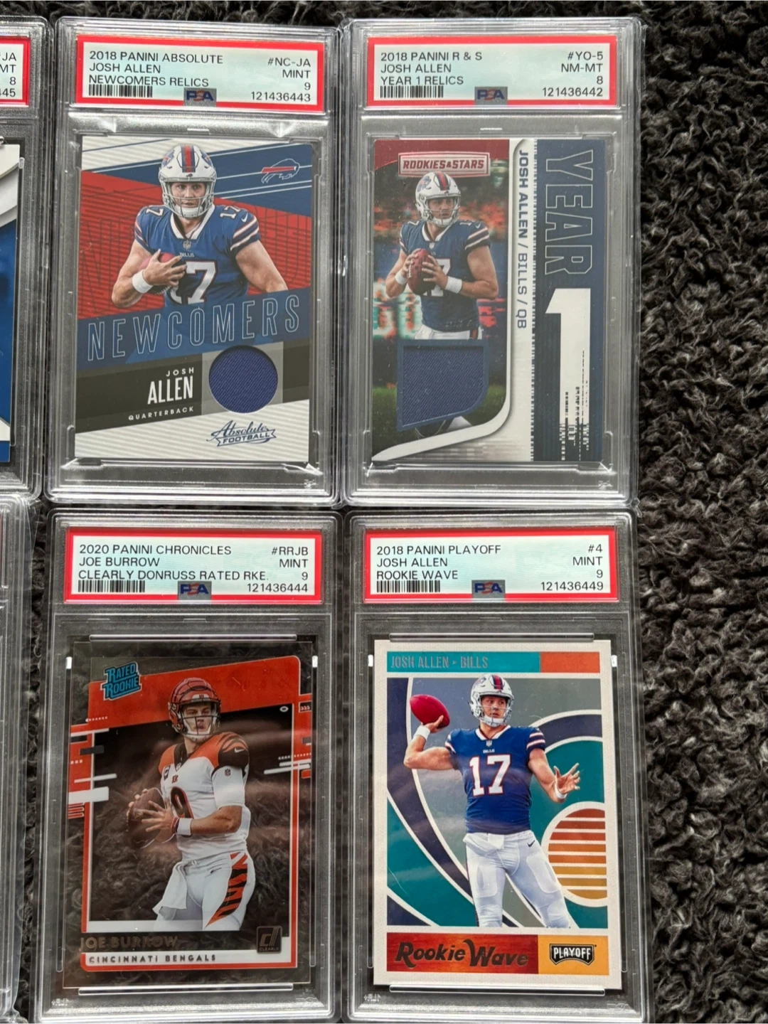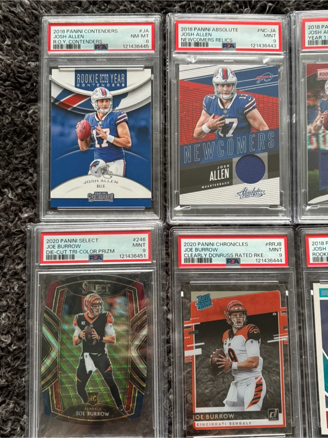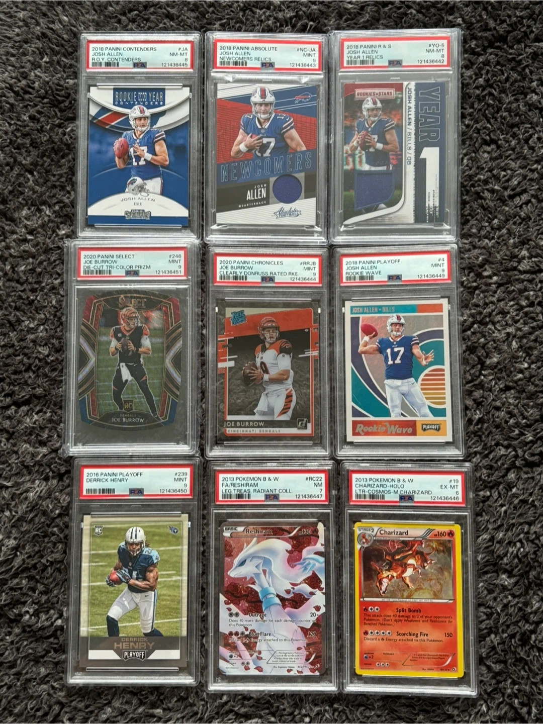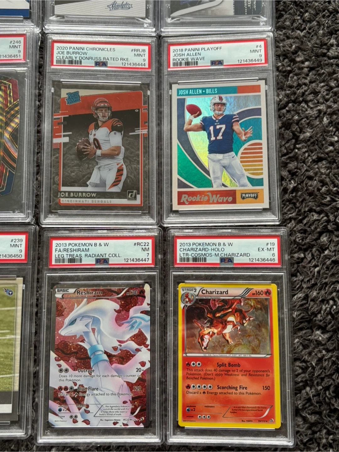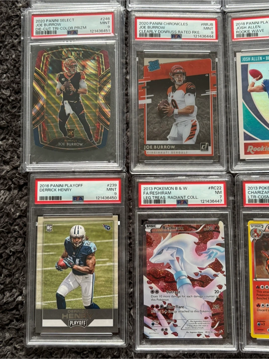 56I have a variety of PSA graded cards for sale. They include football cards of players like Joe Burrow, Josh Allen, and Derrick Henry, as well as Pokemon cards like Reshiram and Charizard. All cards are graded by PSA and encased for protection - message for inquires on any card - if there’s a card/player/team that is not listed that you are interested in, please message as well - includes rookie cards, patch cards, and more - located at dufferin and Lawrence