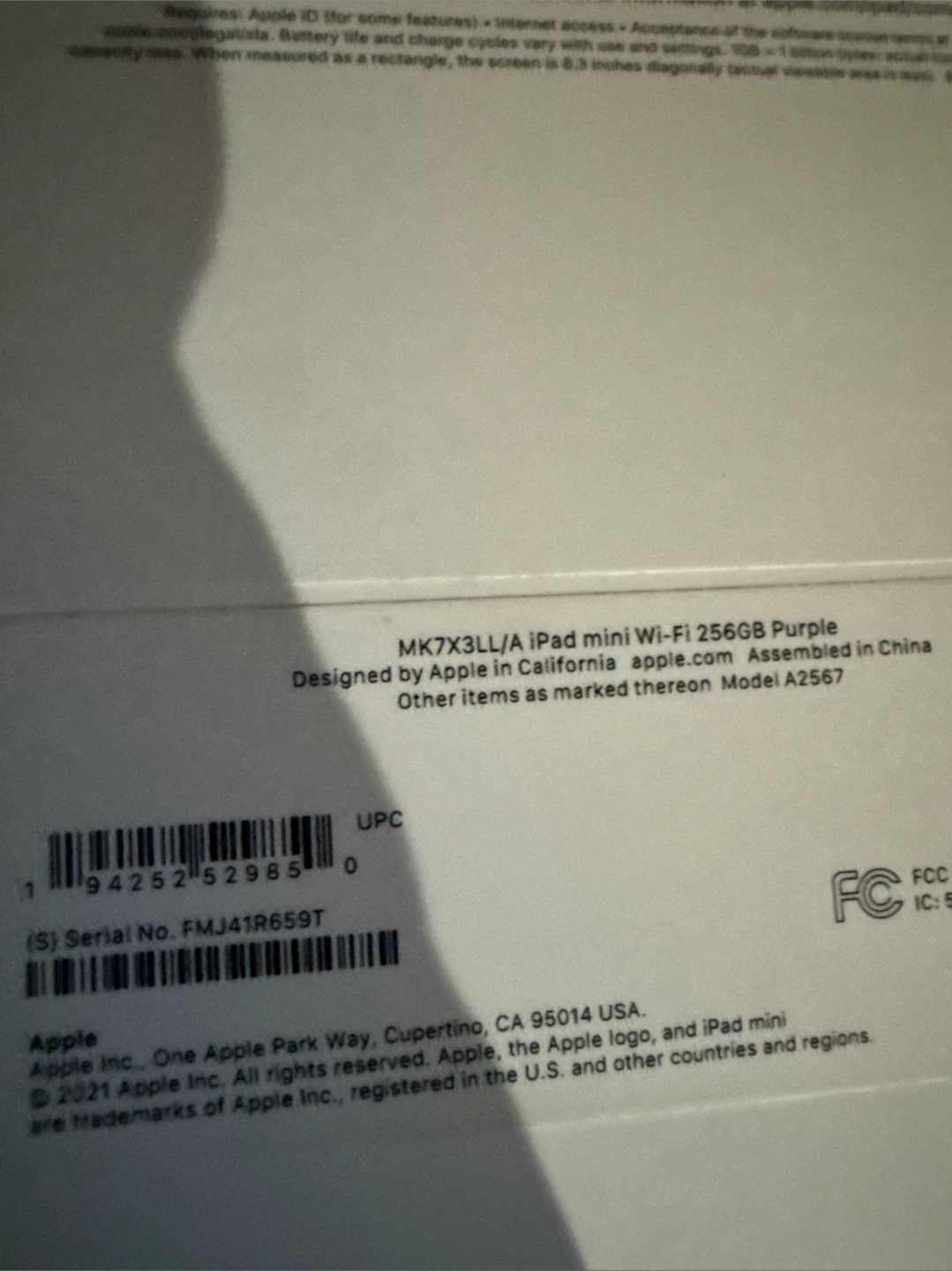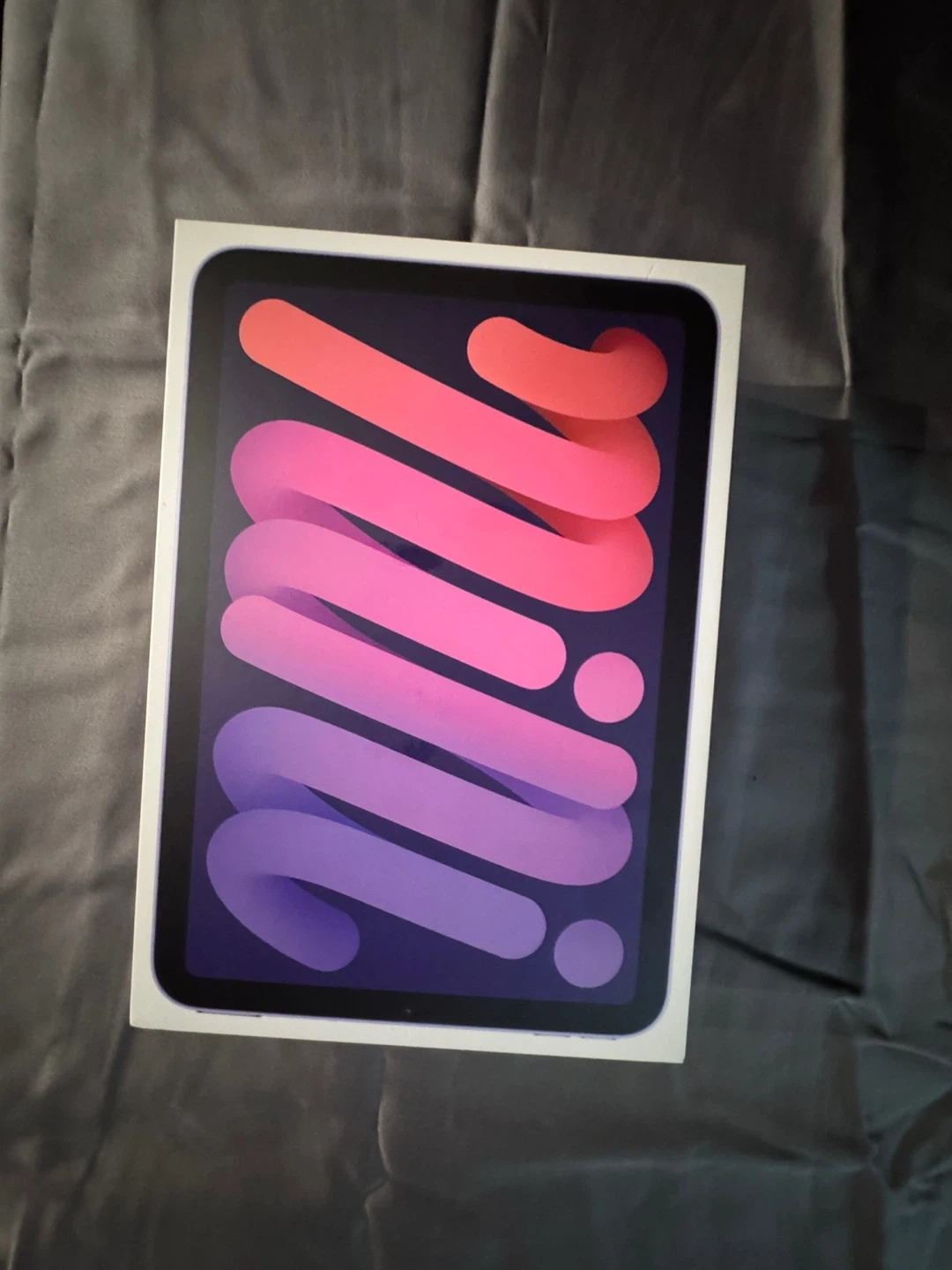 Selling a like new opened iPad mini. It's the Wi-Fi model with 256GB of storage in a lovely purple color. The box is included, and the model number is MK7X3LL/A. This iPad mini has a screen that measures 8.3 inches diagonally