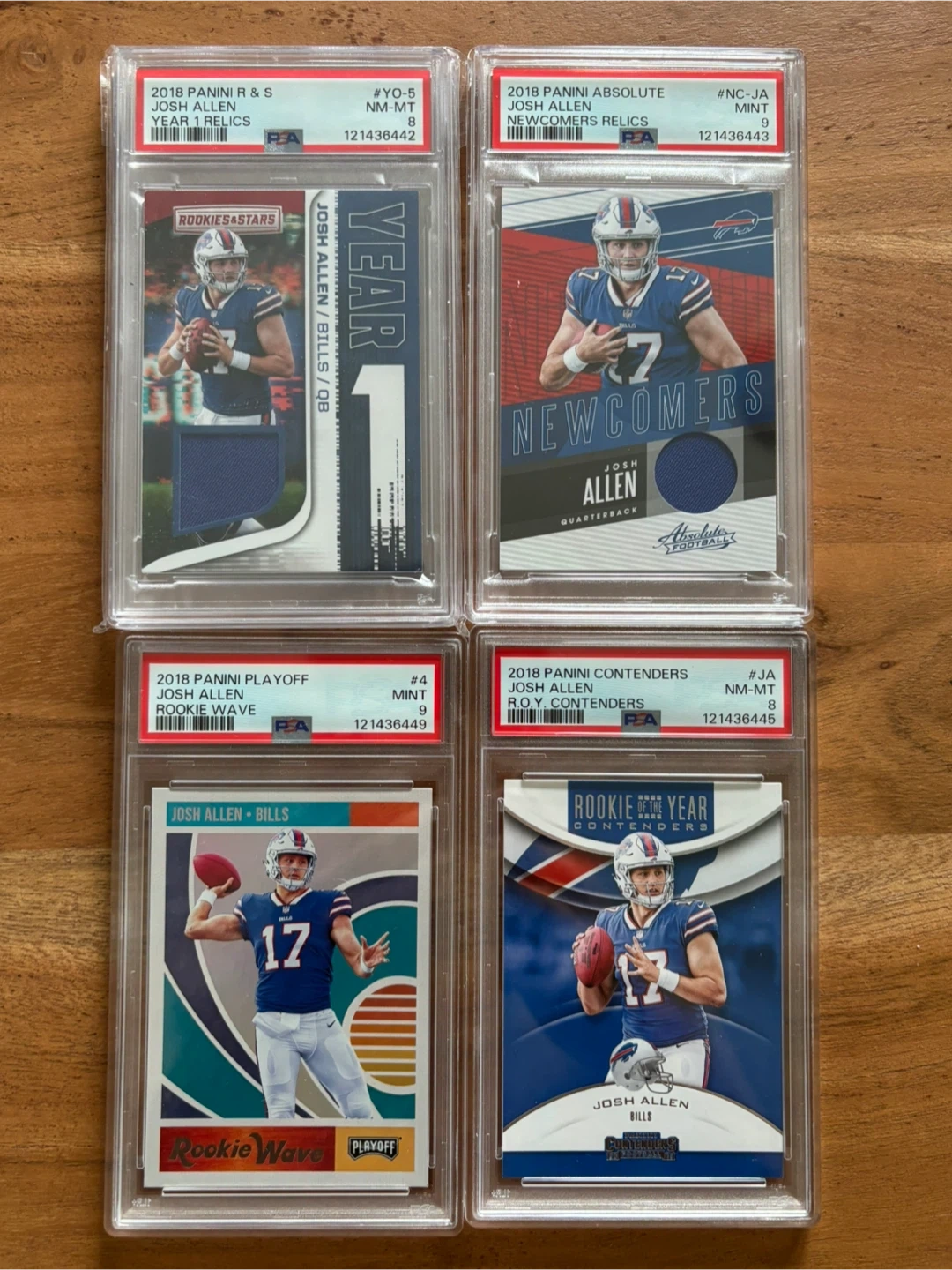 56Selling a set of 2018 Panini Josh Allen football cards. Includes R&S Year 1 Relics, Absolute Newcomers Relics, Playoff Rookie Wave, and Contenders R.O.Y. Contenders cards. All cards are graded and in mint or near-mint condition! **Josh Allen PSA Graded Rookie Cards** - message for inquires - located at dufferin and Lawrence