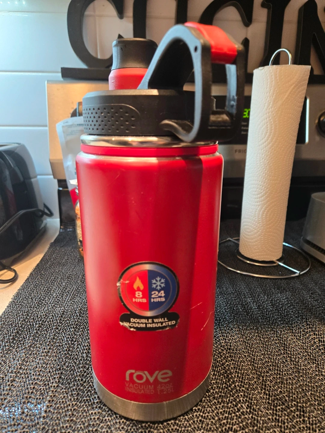 Selling a red Rove vacuum insulated water bottle. It holds 42oz (1.25L) and keeps drinks hot for 8 hours or cold for 24 hours. Great for staying hydrated!