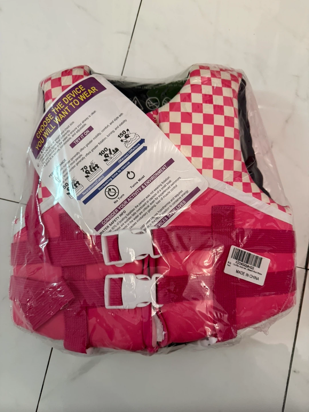 I have a brand new infant life jacket for sale! It's size S and suitable for infants weighing 11.8-15kg (26-33 lbs). It features a pink and white checkered design. Great for keeping your little one safe while enjoying water activities