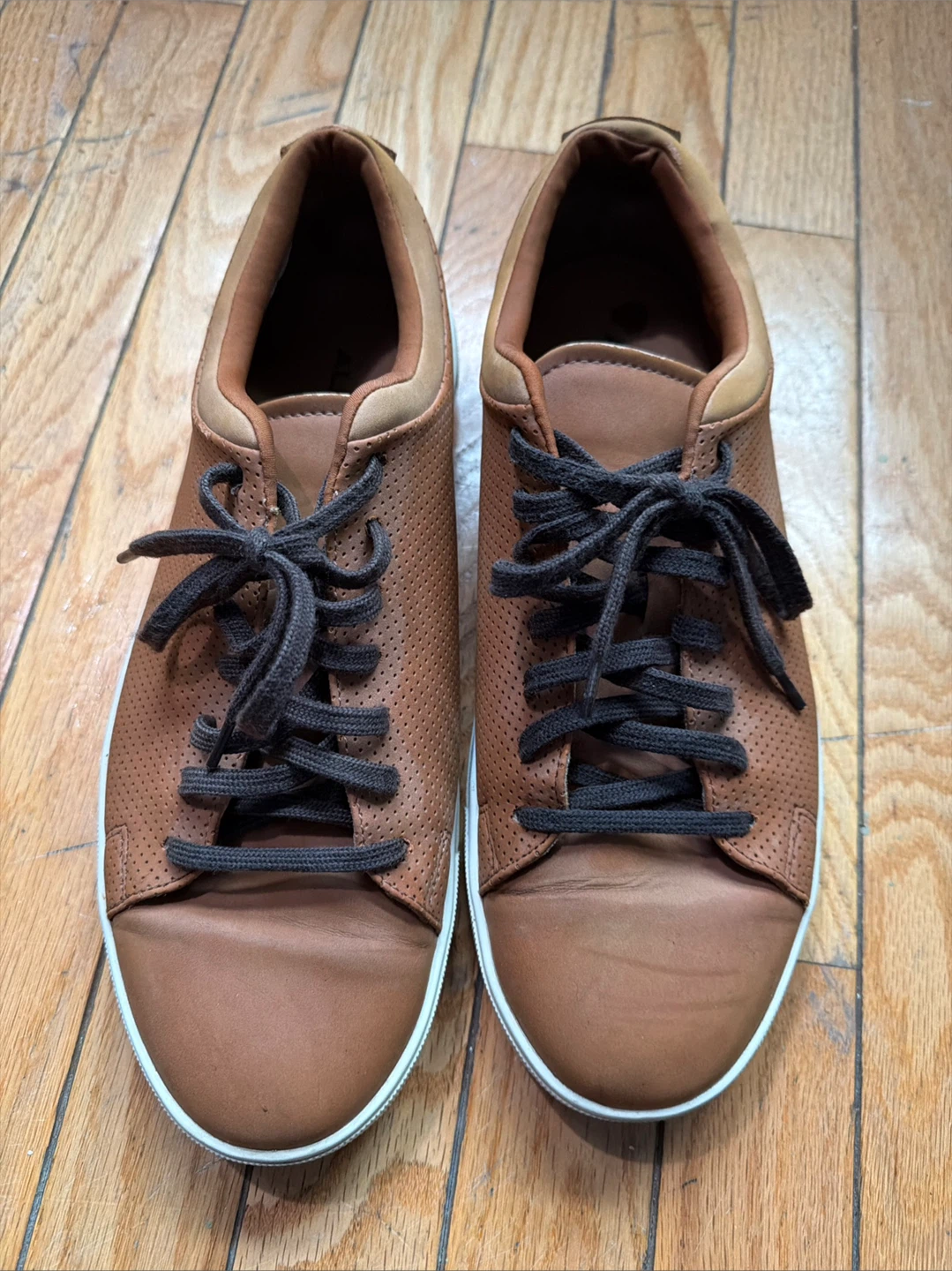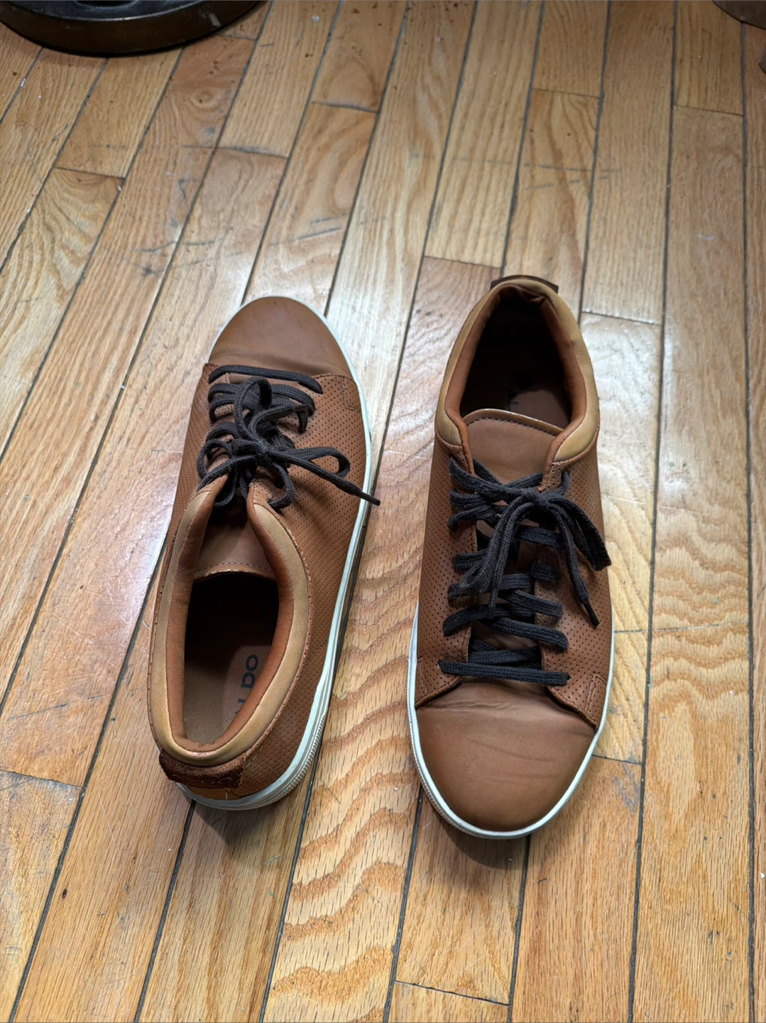 Selling a pair of Aldo brown leather sneakers. They are in used condition, as you can see from the soles, but still have plenty of life left! They feature a classic lace-up design and a comfortable fit. Perfect for casual outings!