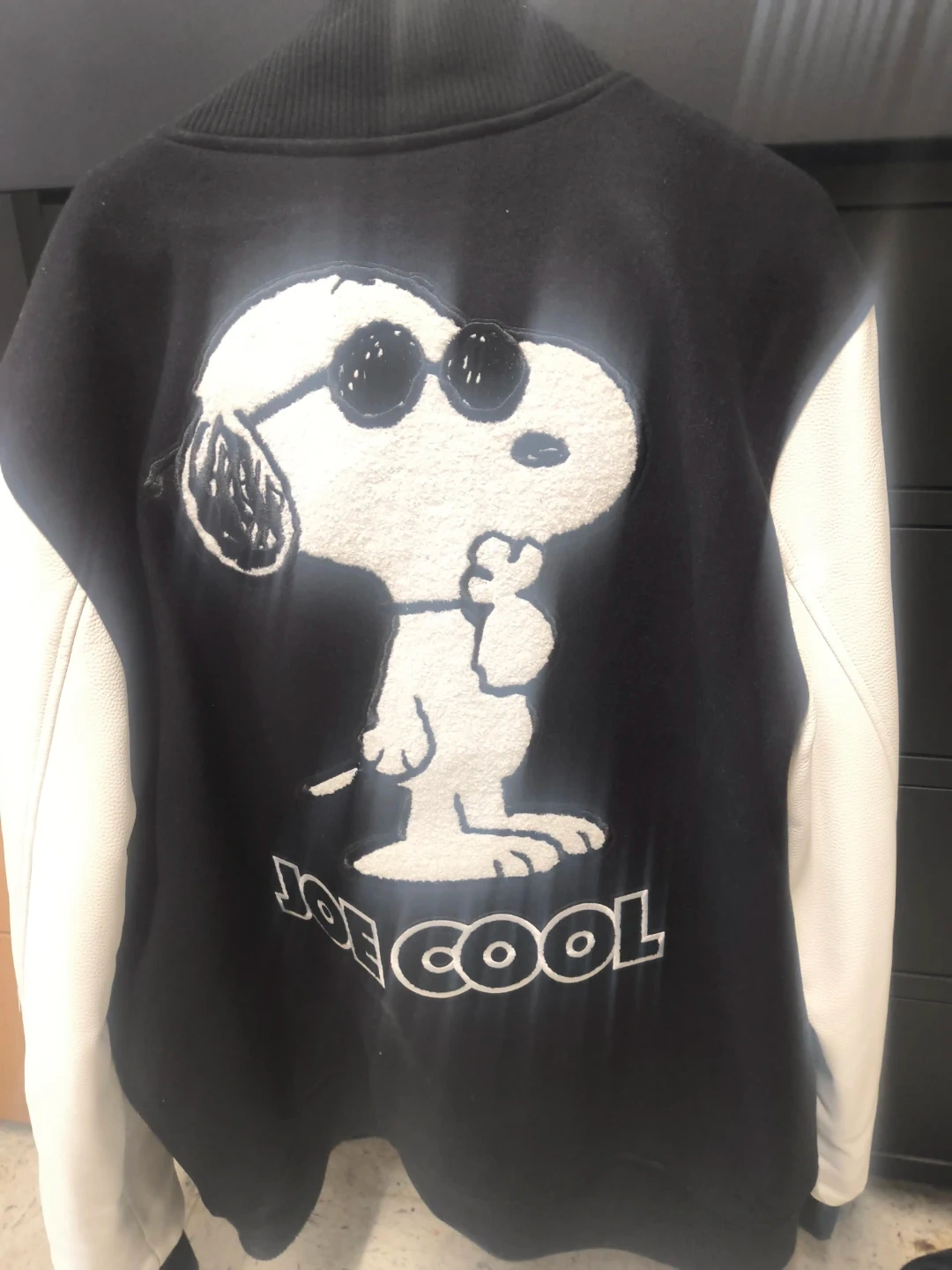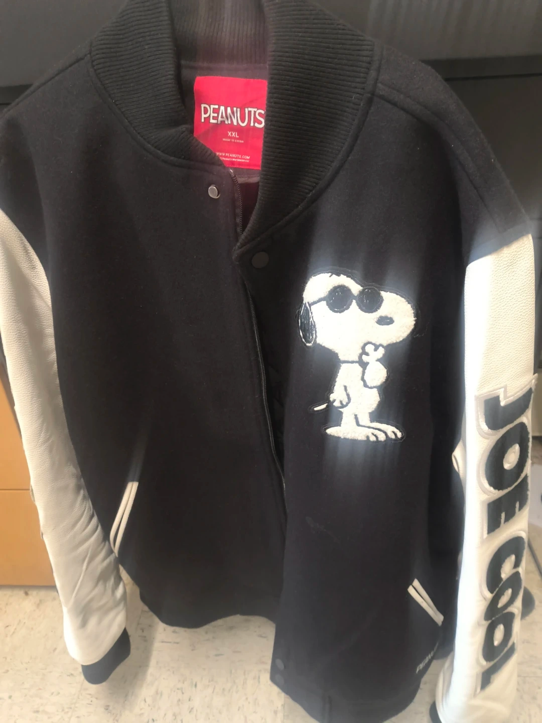 Selling a Peanuts varsity jacket featuring Snoopy as Joe Cool! It's a size XXL and has a classic varsity style with black body and white sleeves. The jacket has Snoopy on both the front and back. Perfect for any Peanuts fan!