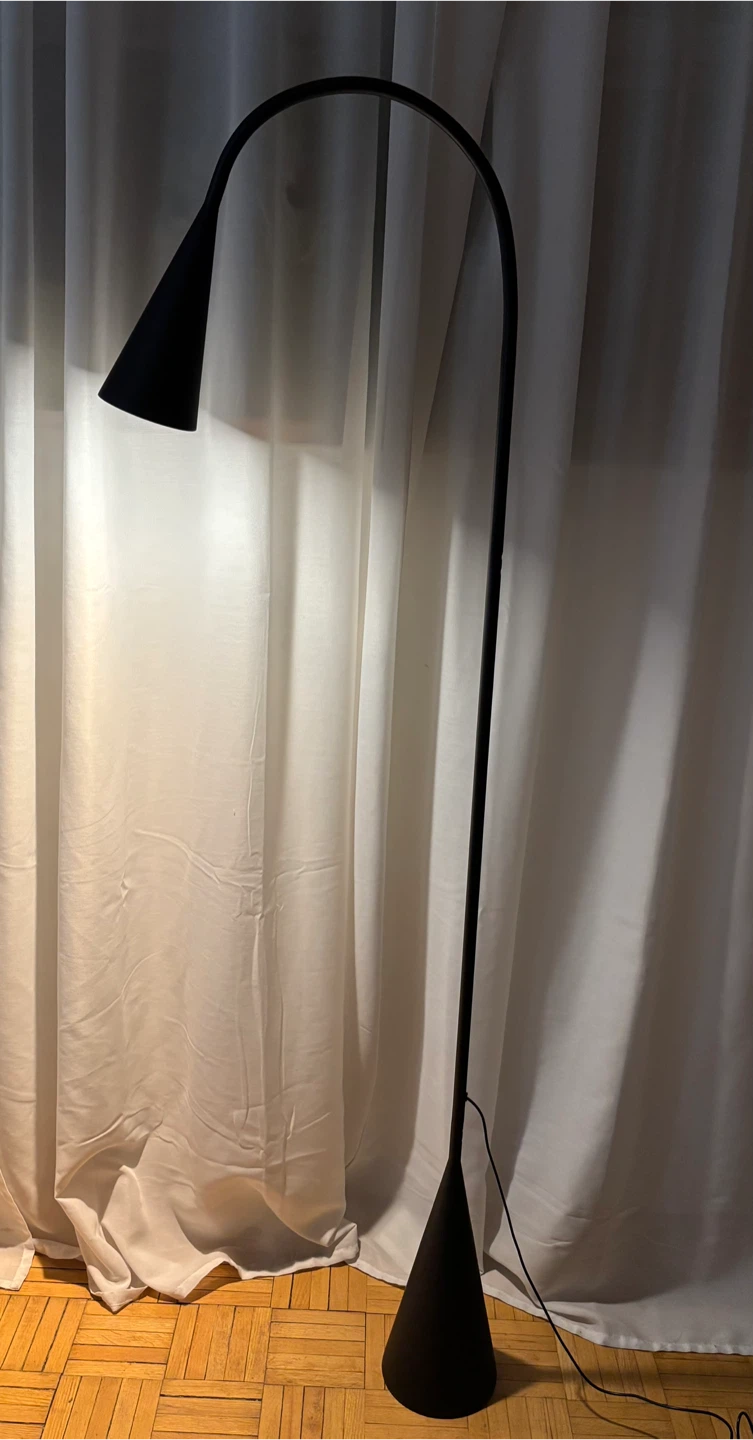 Black IKEA DELAKTIG LED floor lamp! It's in great condition and ready to brighten up your space. Perfect for adding a touch of modern style to any room. Original price $99 + tax.