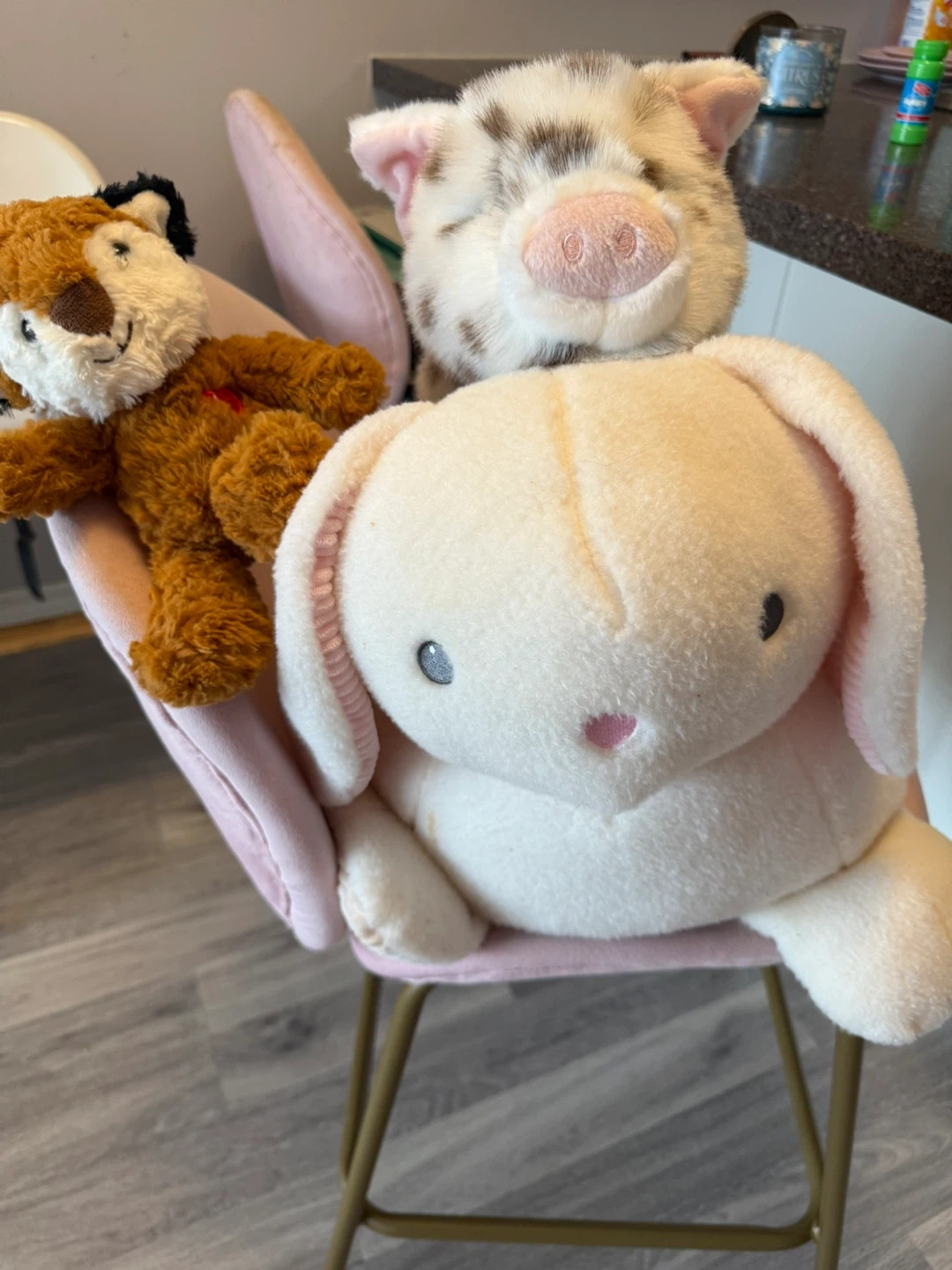 Selling a cute bunny plush toy! It's in good condition, perfect for cuddling or as a charming addition to any collection. Please note that there are some stains on the plush. Comes with piggy and bear plush