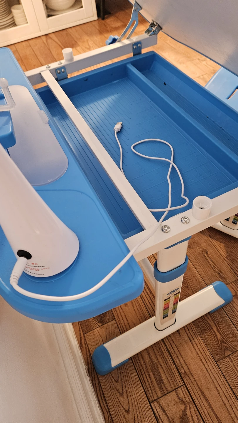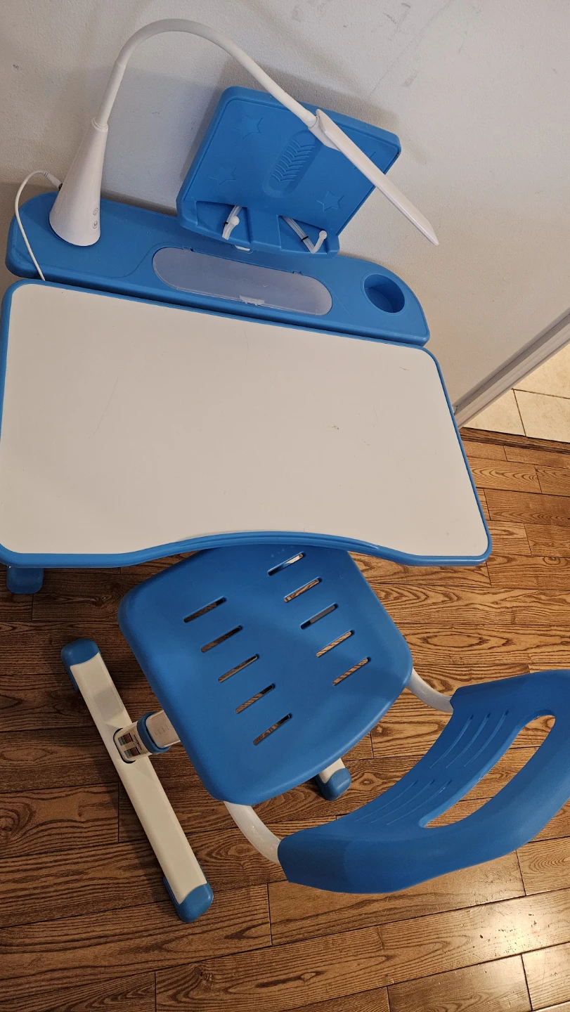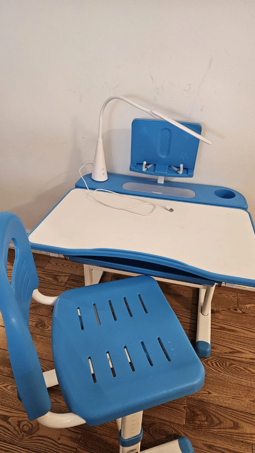 Giveaway, a height-adjustable kids desk and chair set! It's in great condition and perfect for creating a comfortable and ergonomic study space for your little one. The desk features a built-in lamp and a book stand, making it ideal for reading and homework