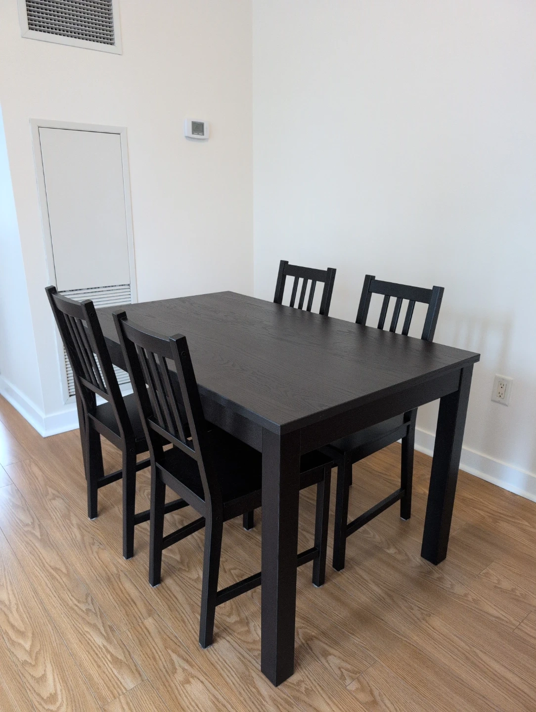 Excellent condition IKEA EXTENDABLE Table with 4 Chairs - Black/Brown Colour - 4 STEFAN chairs - Extension makes seating capacity up to 6 people - Excellent condition (we have used a thick table cloth always. Only 1 chair has a scratch photo included, otherwise everything else is great condition.) Measurements in photos Pet / Smoke / Child Free home Can sell chairs and table separately - just let me know Pick up at Bremner / Spadina (Open to deliver for $50 if needed depending on location)